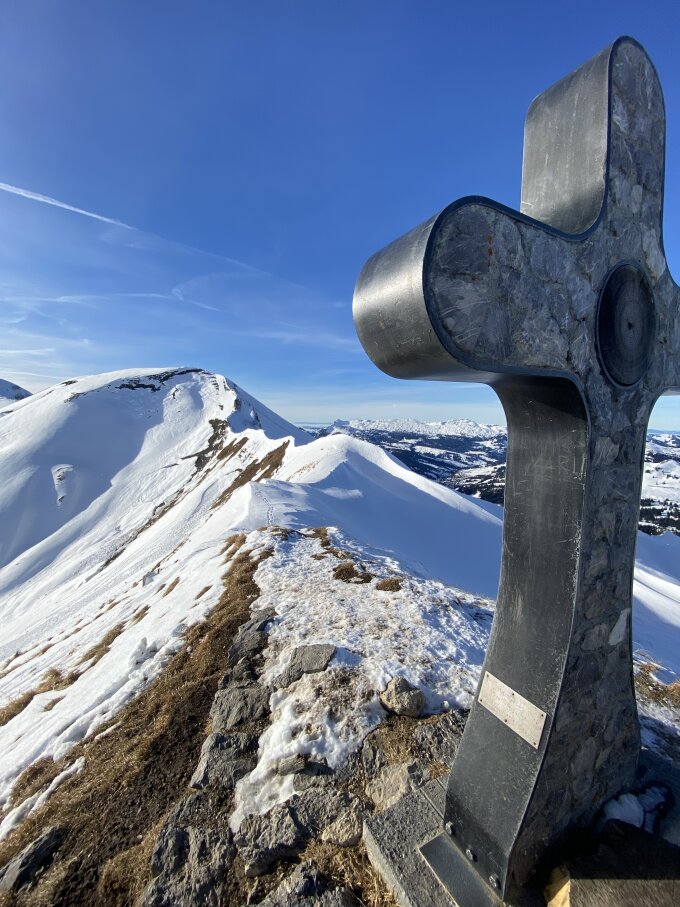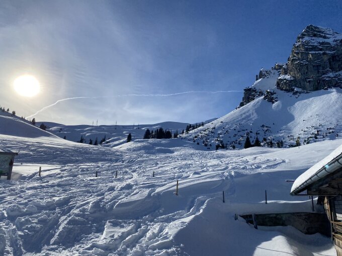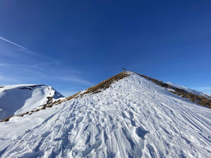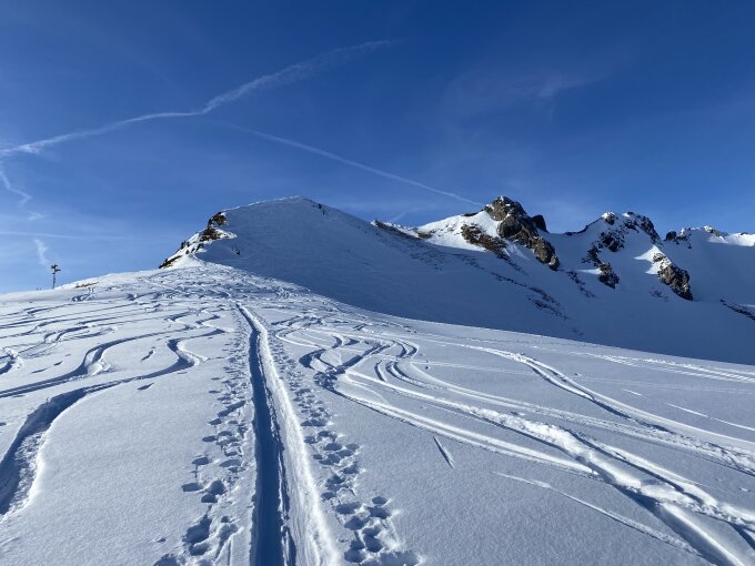 Schön, sonnig, ab Parkplatz gute Aufstiegsspur bis zum Gipfel. Die Nordhänge sind schön pulvrig, ansonsten schwerer Pulver.