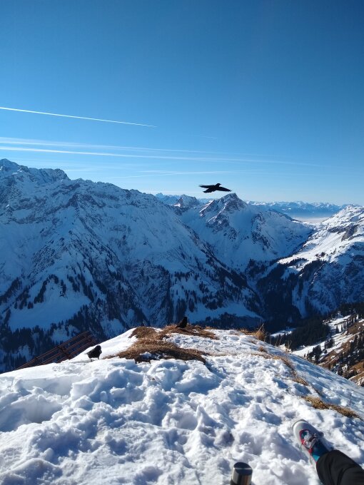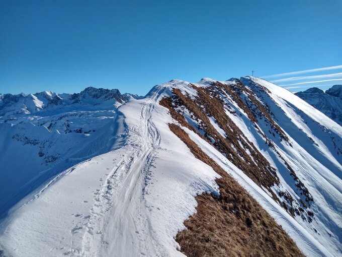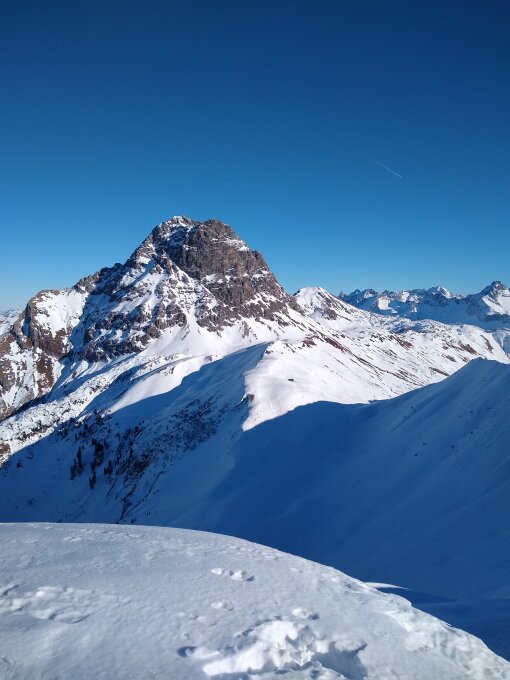in den Schattenhängen noch "Pulver" mit leichtem Deckel, der aber keine Probleme macht. Im sonnigen Gipfelhang im unteren Bereich ein Gleitschneemaul
