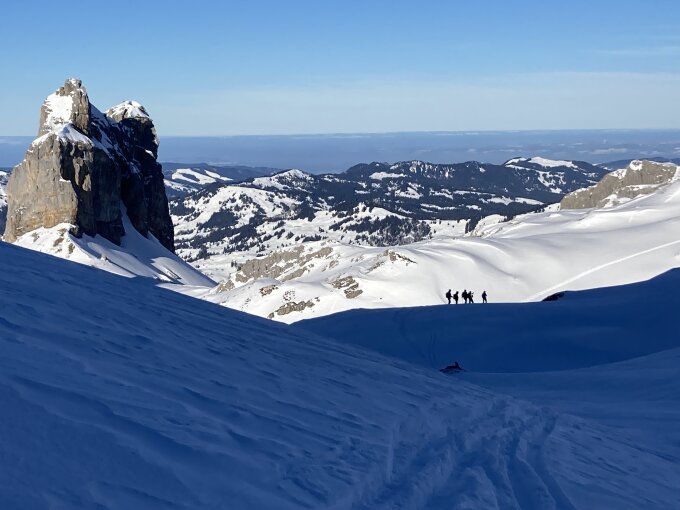 Im Aufstieg gab es kurze vom Wind verblasene Stellen, aber Harscheisen haben wir trotzdem nicht montiert, es ging auch ohne. Am Vormittag wehte noch ein mässig kalter Wind, aber windstille Plätzchen für Pausen lassen sich gut finden.