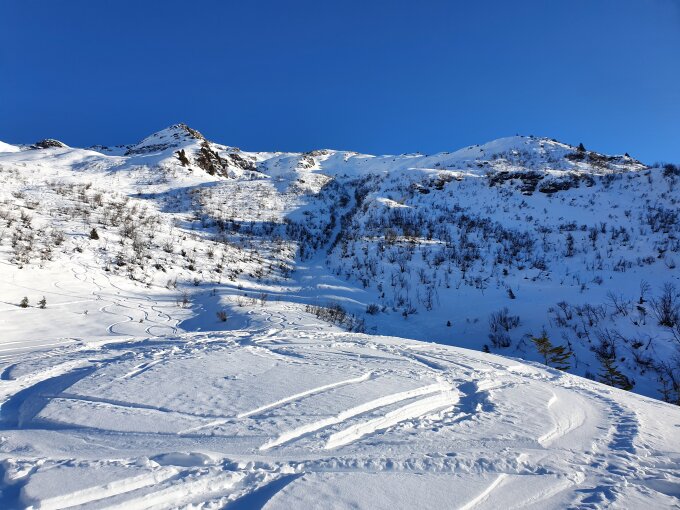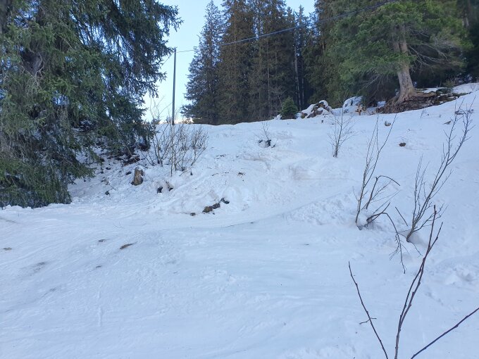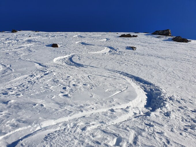 Zur Abfahrt; nach 20 Höhenmeter seitliches Abrutschen war die Abfahrt mit Pulverschnee bis P1513 ein Traum. Danach war es pistenähnlich stark befahren und es hatte auf dem Weg vereinzelte Steine bis nach Engi Weberei (ÖV-Haltestelle).
