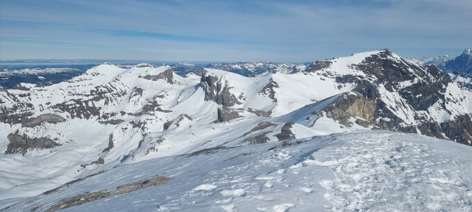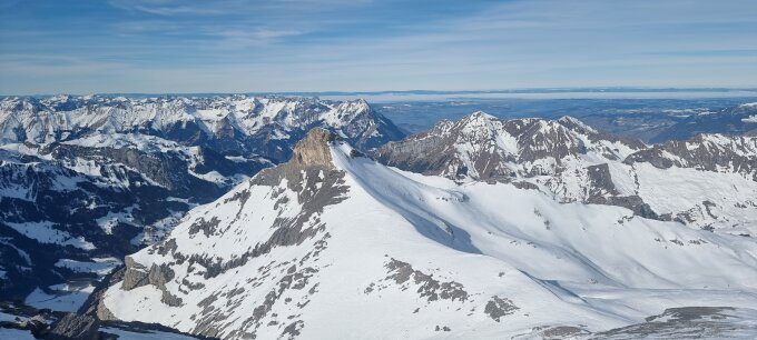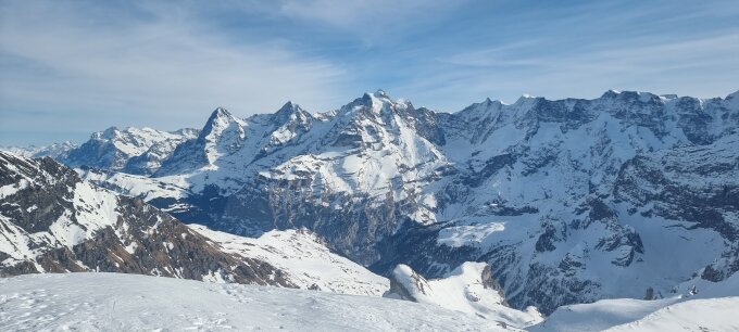 Von Stechelberg mit der ersten Bahn um 07.55 Uhr Richtung Schilthorn. Nach Kaffee und Nussgipfel im Drehrestaurant los um 09.30 Uhr. Mit aufgebundenen Skis dem Grat entlang bis zum Sattel bei Punkt 2798. Teilweise ausgesetzt, aber mit guten Trittspuren und Sicherungsseilen. Die Metalltreppe ist schnee/eisfrei. Ca. 45 Minuten. Von dort Abfahrt Richtung Rote Härd, etwas links davon vorbei bis die Felle aufgezogen werden. Aufstieg locker bis auf eine pickelharte, eisige und steile Stelle von ca. 50 Hm vor der Ausstiegswächte zum Gipfelplateau. Skis aufgebunden und Steigeisen montiert. Geht gut und sicher. Dann noch ein paar Schritte bis zum Gipfel. Rund drei Stunden ab dem Schilthorn, inkl. Pausen. Abfahrt über den wunderbaren Osthang hinab. Ganz oben finden sich einige lästige Eisplatten, dann aber Pulver vom Feinsten. Weiter bis oberhalb der Rotstockhütte. Dort anfellen und hoch zur Wasenegg auf ca. 2280 m mit der heissen Sonne im Rücken. Zum Glück liegt wenig Schnee, so dass aus den steilen Hängen von links keine Lawinengefahr droht. Leider folgt dann der Pflichtteil in unübersichtlichem Gelände mit teilweise üblem Bruchharsch runter nach Gimmelen und schliesslich auf der Piste nach Mürren. Insgesamt eine sehr schöne Tour bei wechselnden Verhältnissen, die einiges an Einsatz verlangt. Zwischen dem Schilthorn und Mürren waren wir über sechs Stunden unterwegs und haben ab dem Sattel keine Menschenseele mehr angetroffen.