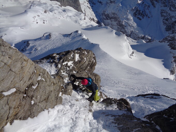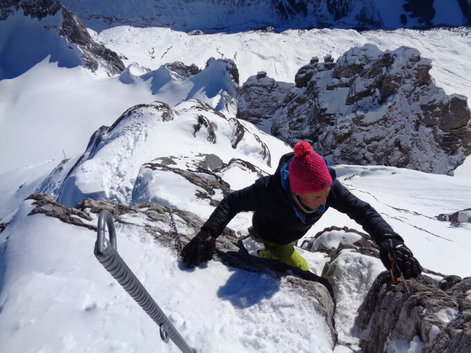 Aufstieg: Waldweg im Brunnital war gepistet. Anschliessend ausezeichnet angelegte Aufstiegsspur. Der Aufstieg vom Skidepot über den Ostgrat hatte im oberen Drittel auf den abwärtsgeschichteten Kalkplatten lockeren, körnigen und haltlosen Pulverschnee darauf. Das war mir zu heikel, und wir sind 10m weiter rechts durch die Schneeflanke (40 Grad) zur Kette in den Felsen aufgestiegen.