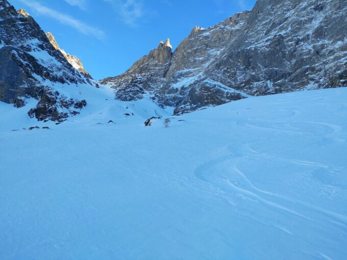 In der Ruchen-Chäle obwohl verfahren, fand man am Rand immer noch 20cm wunderschönen Pulverschnee. Die Waldpartien hatten auch besten Pulverschnee.