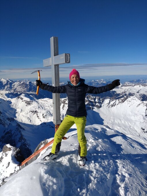 Im Sattel über der Ruchen Chäle glitzert die Weite vom Ruchenfirn ins Auge! Auf dem Ostgrat zum Gipfel schweift das Auge bis zur Monte Rosa Gruppe, und dem Matterhorn. Rechts davon grüssen die Berner Alpen mit dem Finsteraarhorn.