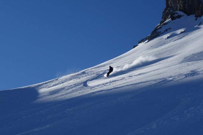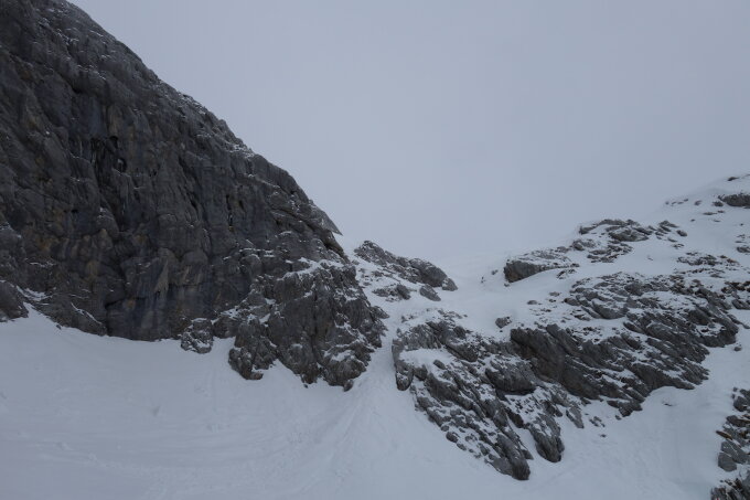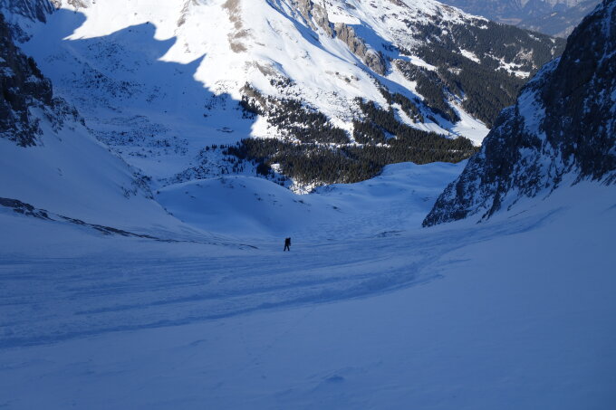 Abfahrt durch den Rachen zur Lindauerhütte: Es hatte Durchweg 20-30cm Pulver, kein Feindkontakt auch wenn die Schneemenge nicht alle Felsen überdeckt. Eine Engstelle hat es bei ca. 1700m wo evtl. die Ski abgezogen werden müssen. Weg ist teils mit Stangen markiert.