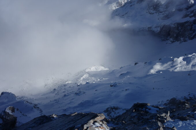 Start um 9:30 bei leichten Schneefall von der Lindauerhütte. Sind über Sporentobel hoch. Durchwegs gute Spur. Es hat viele Tourengeher, nicht alle geübt. An der steilen Querung bei P.2650. entsprechend Stau.