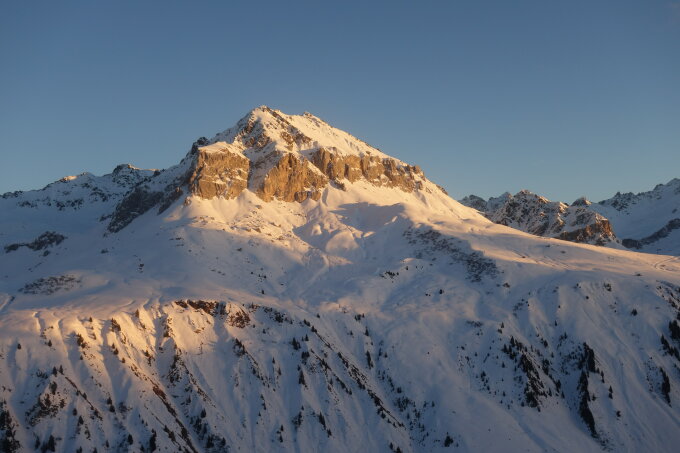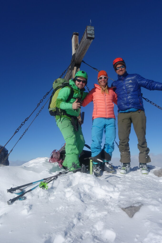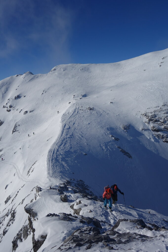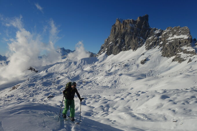 Aufgrund der nachfolgenden Masse an Tourengehern zum Mittleren Drusenturm ausgewichen. Abfahrt durch die Querung am Sporaturm im besten Pulver. Couloir entlang der Falllinie vom Turm unverspurt mit besten Powder.