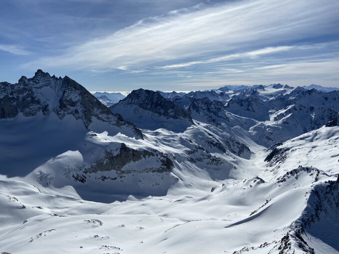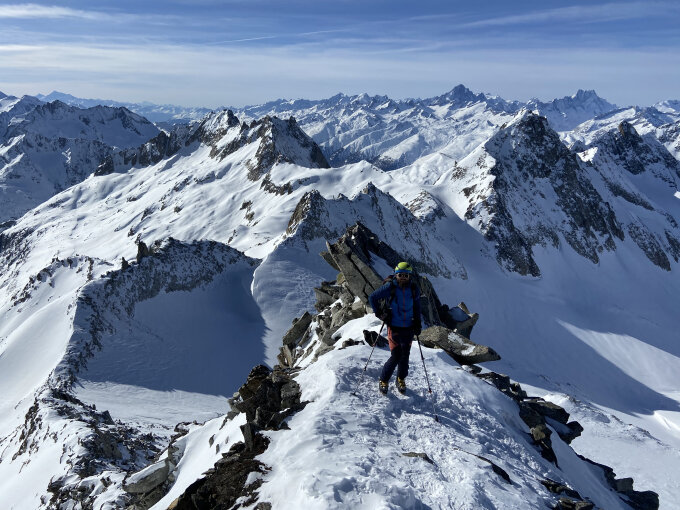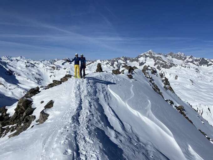 Schneebedingungen auf der ganzen Route erstaunlich gut, bis auf die ausgeblasenen Gipfelflanken des G.L. Wir haben beim Zustieg via Stelliboden und die Nordflanke des Tälligrats gleich das Rottällihorn mitgenommen. Hier kann man ohne Harscheisen/Steigeisen bis zum Gipfel gehen. Der Travers zum Leckisattel wird dieser Tage zu Fuss gemacht, Steigeisen sind nicht nötig. Die neue Pulverschicht hält sehr angenehm. Aufstieg zum G.L. Gipfel teils auf Felsblöcken, teils auf Schnee.