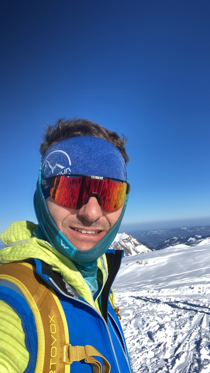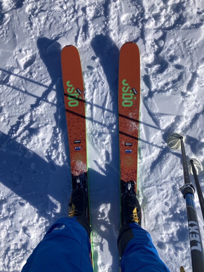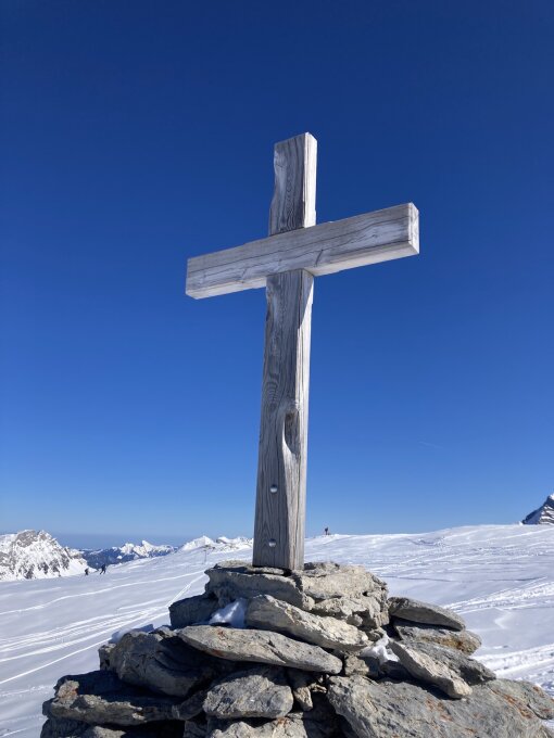 Heute top Bedingungen auf der gesamten Route, super Pulverschnee für die Abfahrt. Schon recht zerfahren aber es hatte noch reichlich Platz um eine eigene Line zu ziehen.