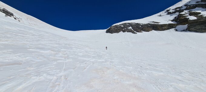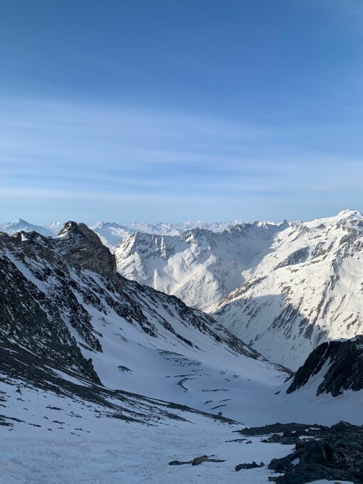 Schnee durchgehend ab Abzweiger Barcuns Dado. Gute, tragende Spur, obwohl nicht gefroren. Ab ca. 1900 M.ü.M. gut gefrorener Firn, super zu gehen. Viele Stellen aper vom Wind, aber trotzdem durchgehend im Schnee machbar. Bei P.2994 ca. 50 Hm aper, auch gut zu gehen. Übergang Porta da Gliems sehr guter Trittschnee. Bifertenfirn unten gut, oben ein paar Zastrugis.