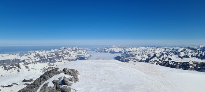 Beinahe windstill am Gipfel und gute Fernsicht bis zu den Walliser Alpen.