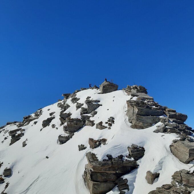 Ab Innerferrera ca. 150HM Skitragen, danach durchgehend Schnee. Beste Verhältnisse in der gesamten Tour - guter Trittschnee im Couloir ab Skidepot. Abfahrt 1215 ab Skidepot komplett auf Hartschnee, war gut zu fahren.