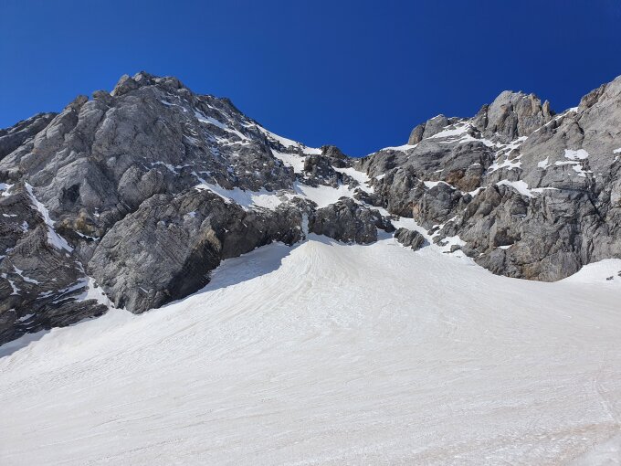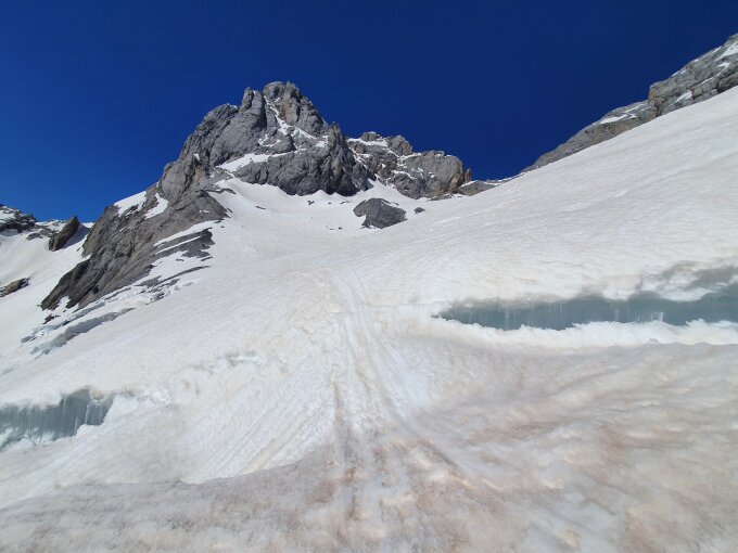 Beide Bergschrunde (erster bei ca. P2500; siehe Bild und zweiter beim ersten Skidepot bei ca. P2854) sind noch sehr gut eingeschneit.