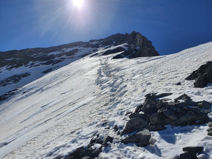 Der Schlussaufstieg (Skidepot - Gipfel) ist aktuell um 13:45 bereits wieder im Schatten.