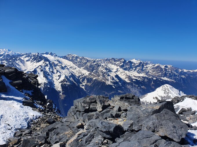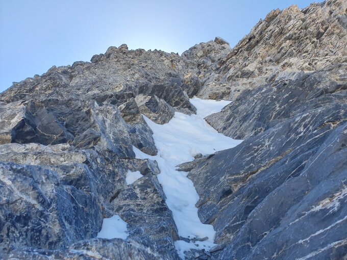 Dann ging es weiter mit Steigeisen und Pickel in gutem Trittschnee zuerst weniger Steil und dann doch immer steiler werdende Flanke hoch bis P3175 und weiter über ein paar anspruchsvollen Felsen zum Gipfel.