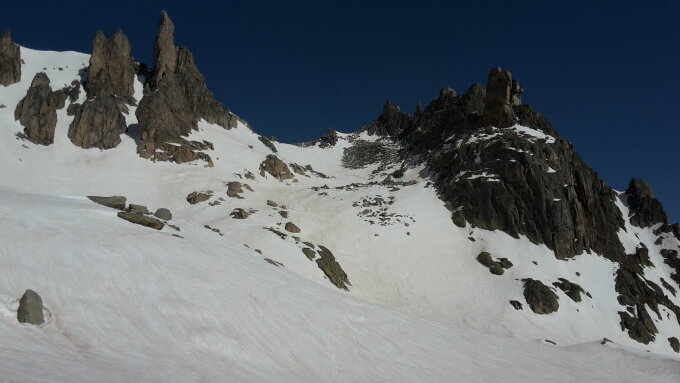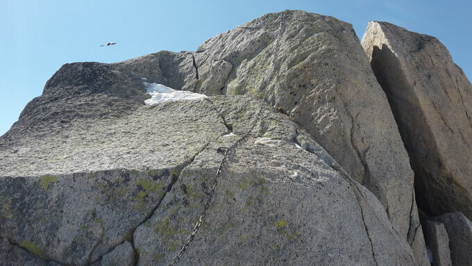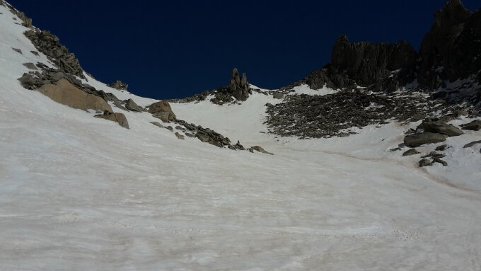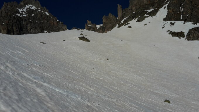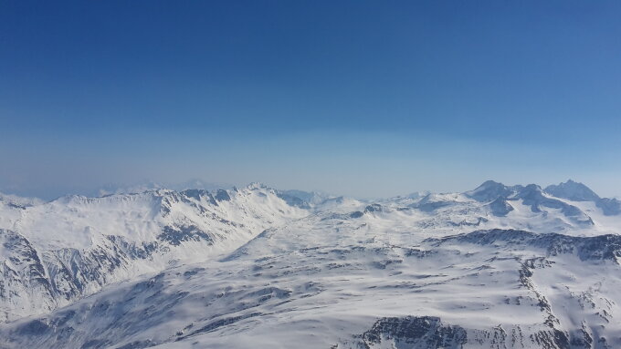 Aufstieg mit Abkürzung der Passstrasse durch die Staudenhänge, noch gut möglich. Gut griffige Spur. Bis Tätsch hauchdünne Eisplättchen auf sulziger Unterlage. Querung oberhalb Tätsch gut zu begehen. Nur zwei kurze apere Stellen. Aufstieg durch die grosse Rinne zur unteren Bielenlücke eher hart, ging jedoch recht gut ohne Harscheisen. Der Gipfelzustieg ab Skidepot ist schneefrei. Am Gipfel trotz eines leichten Lüftchens ganz angenehm zum Verweilen.