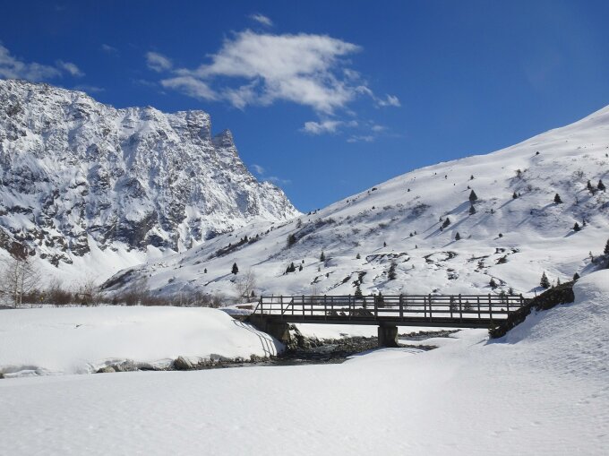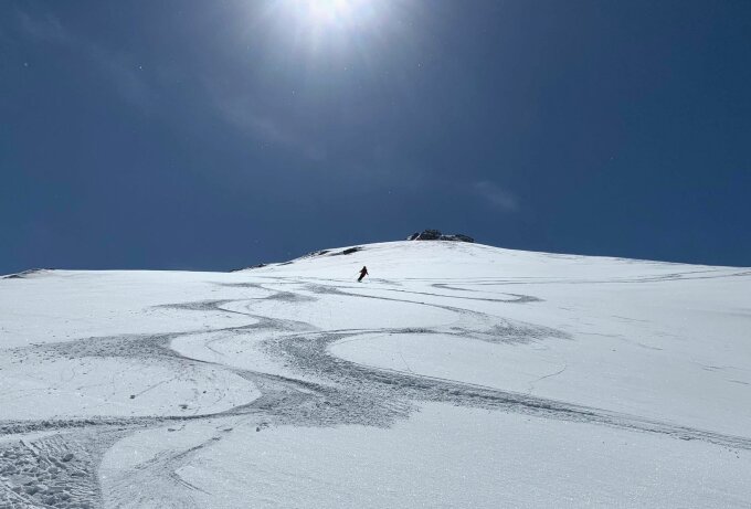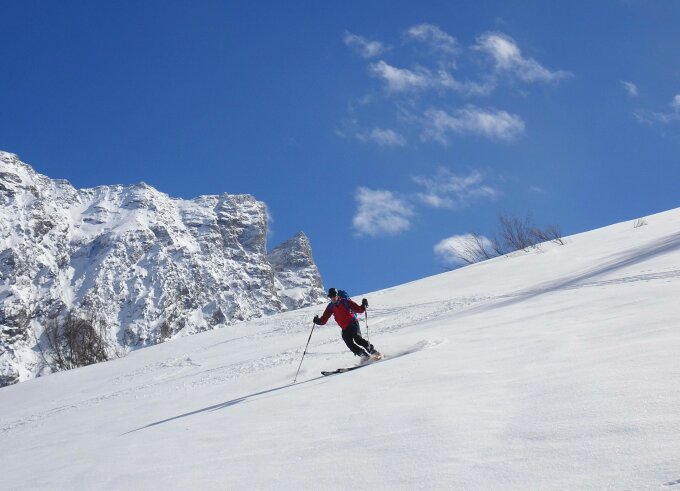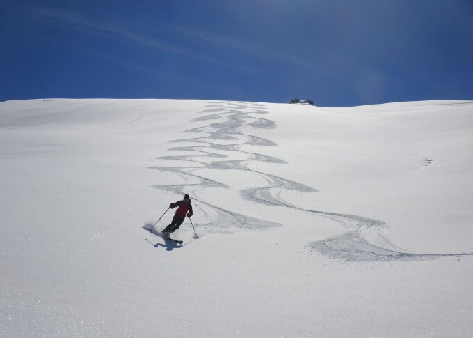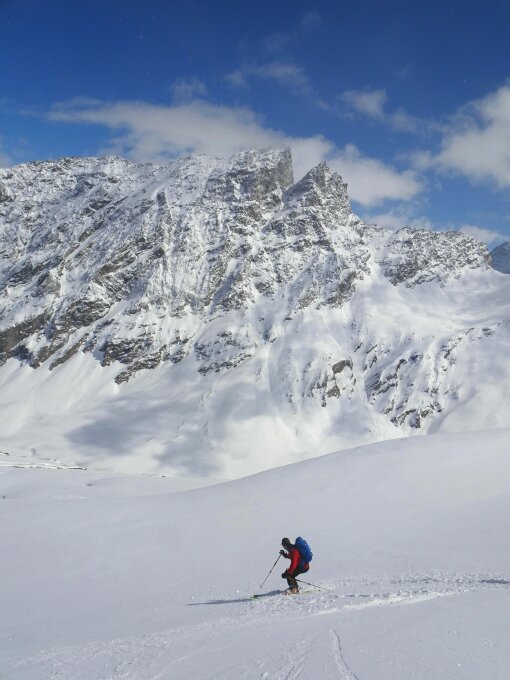 Wenige cm Neuschnee auf fester Grundlage, überraschend gut zu fahren, fast wie Firn. Schöne gleichmässige Hänge mit freier Spurwahl. Bei Radons kurzer Gegenanstieg, der eher flache Alpweg hinunter nach Tigignas ging recht zügig.