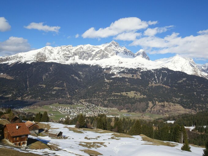 Auf dem Alpsträsschen zwei kurze apere Passagen, sonst noch ausreichend und gut gefestigter Schnee. Kurze Tragestelle nochmals in Radons. Aufstieg Piz Mez mit etwas Pulverauflage und nicht so steil, ging daher ohne Harscheisen.