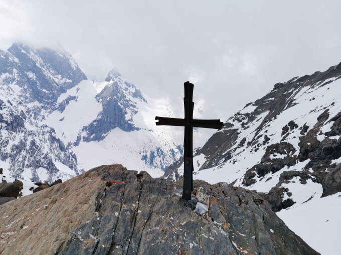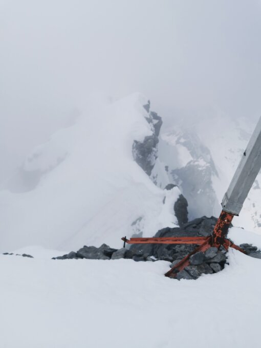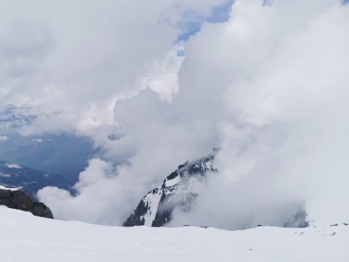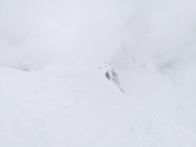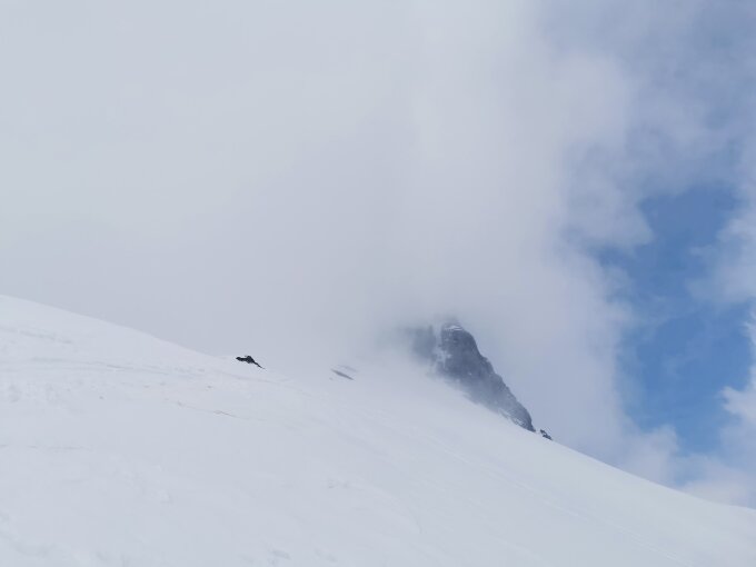 Die Verhältnisse sahen also nicht ideal aus. 7 weitere Leute sind früher oder später wieder umgedreht, so dass ich bald alleine unterwegs war. Letztlich waren aber zumindest aus meiner Sicht alle Lawinen beim Aufstieg durch den Ruchenchälen schon unten und der Schnee war zwar leicht durchfeuchtet, aber trotzdem stabil, so dass man gut aufsteigen konnte. Lt. Skitourenguru war die Tour morgens mit grün eingestuft, durch den Regen am Vorabend aber wahrscheinlich aber an der Grenze zu orange. Auch der weitere Aufstieg vom Pass Richtung Gipfel mit etwas Neuschnee ging gut, der steile letzte Hang ließ sich bis 10 Meter vor der Felspassage mit Ski aufsteigen.