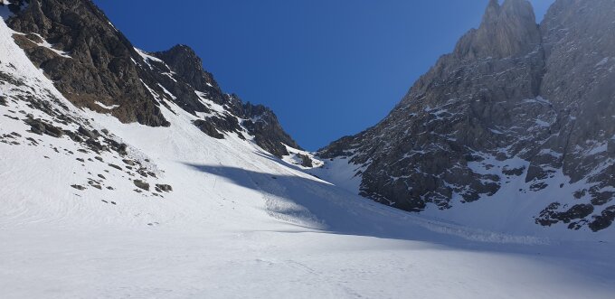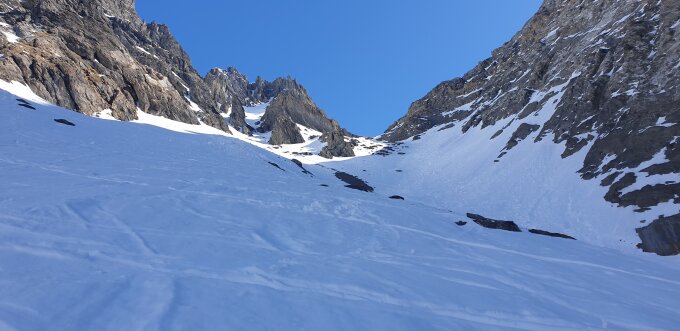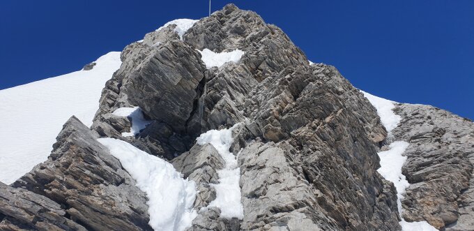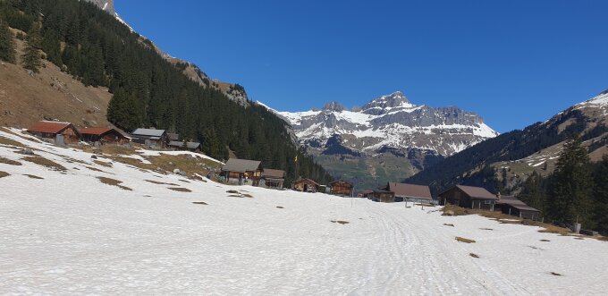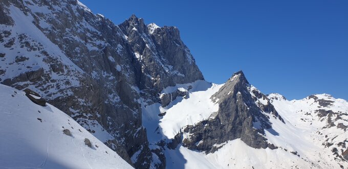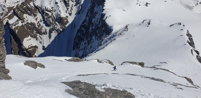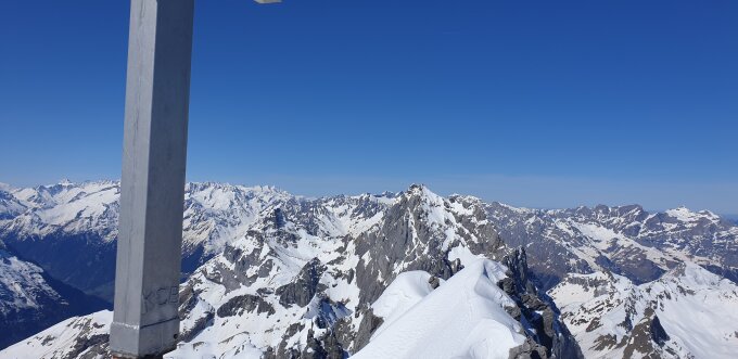Start am 6.00 Uhr bei der Nähe von der Sittlisalp Seilbahn, die Ski mussten nur einige Minuten getragen werden, dann noch einige apere Stellen bis Brunnialp, schon sehr bald mussten die Harscheisen montiert werden, der letzte Teil der Ruch Chälen war dann auch heute anspruchsvoll dem Namen sehr gerecht, Steigeisen waren da sehr hilfreich, der Aufstieg in Richtung Skidebot noch mit Pulverschnee Resten, der Gipfelkopf mit guten Trittschnee rechts den Eisenstangen bis zum Grat, die Ruch Chälen um 12 Uhr immer noch Pickelhart, dieser Teil sicher nur machbar Skitechnisch gesehen.