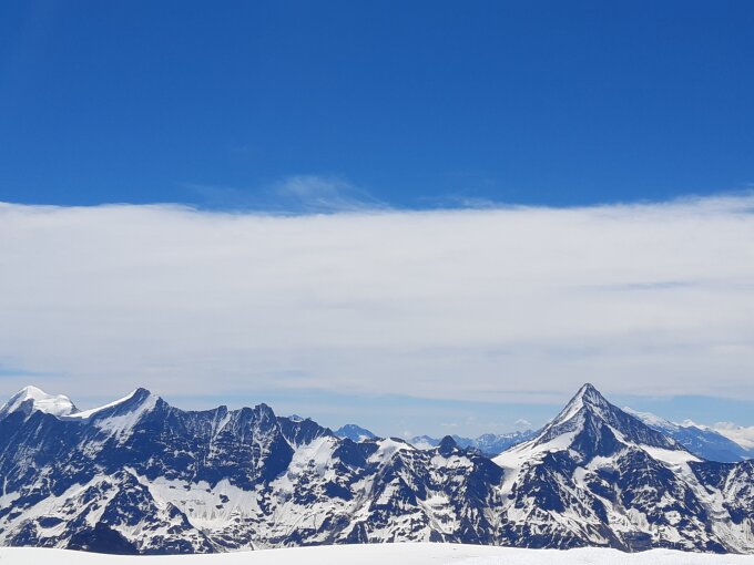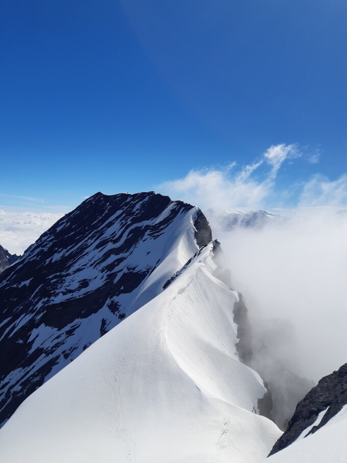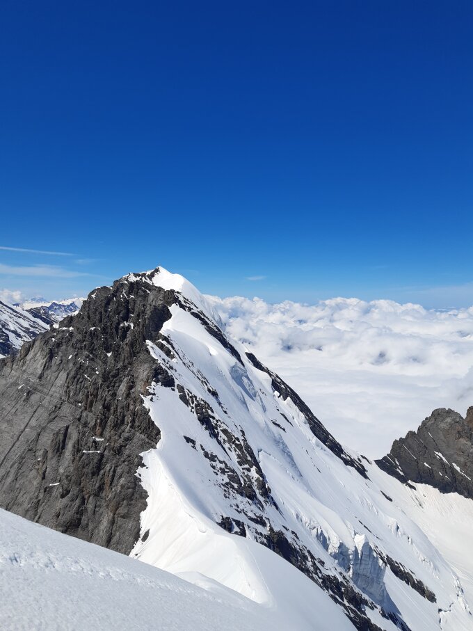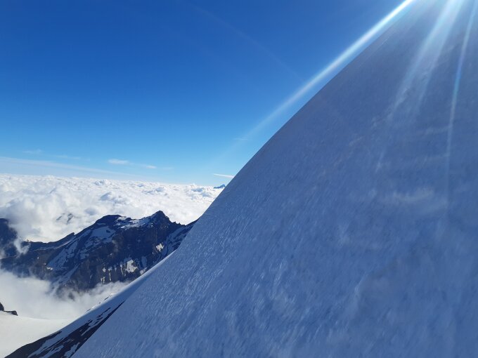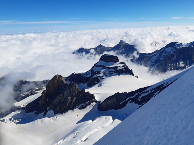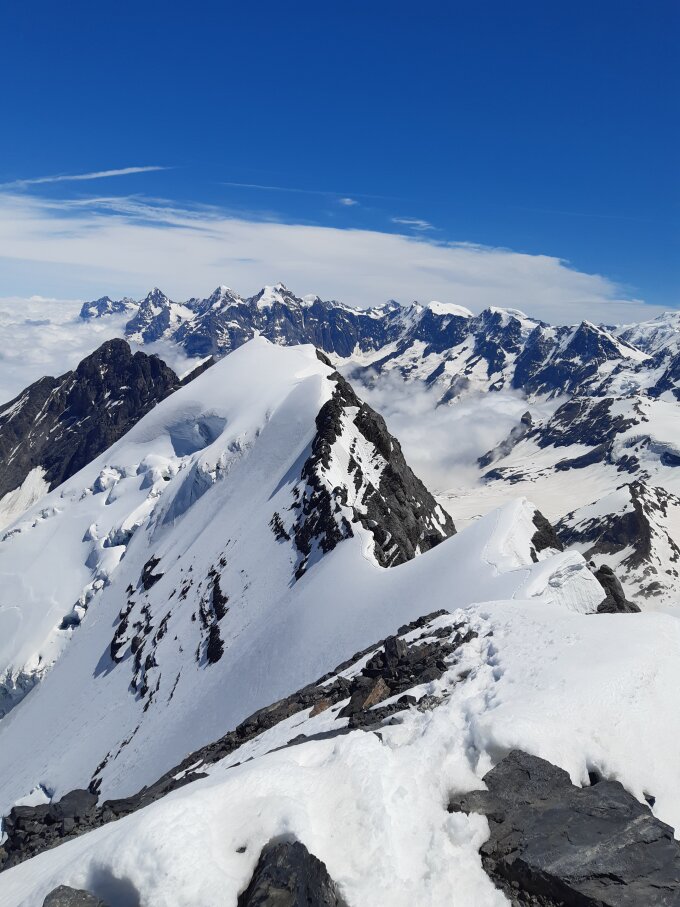 Verbindung Grat Wyssi Frau-Morgenhorn lohnt sich nicht, besser von Wyssi Frau absteigen. Sehr weich Schnee am Grat und Abstieg von Morgenhorn ca 150m abklettern oder Abseilen ( blank Eis ).