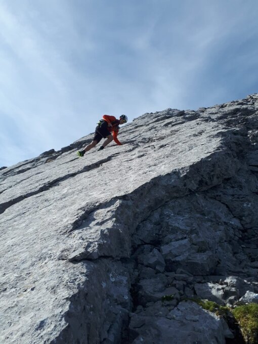 Direkt über den Sassigrat zum Einstieg, einige Markierungen, neuere Seile.