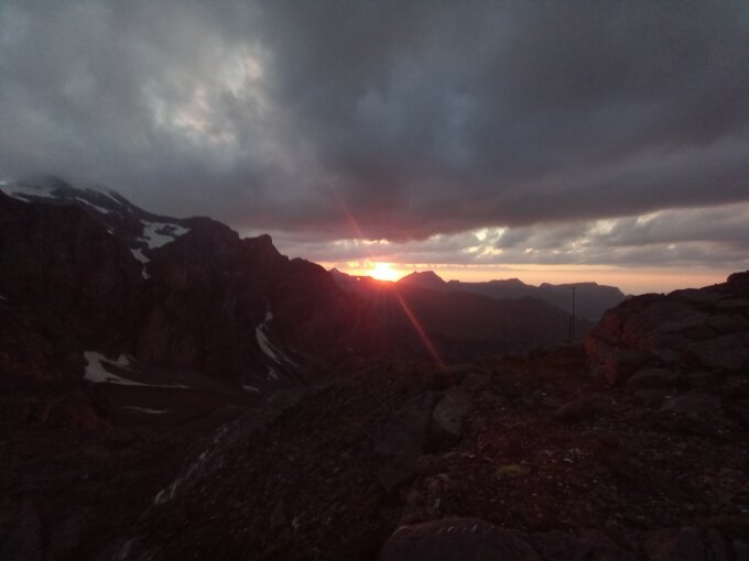Aufstieg am Vortag von St. Jakob über Biwaldalp zum Gitschenhörelihüttli und Übernachtung. Start um 6 Uhr und auf der Möräne hoch zum Pkt. 2429 und weiter bis unter die "Südwand". Beim Einstieg noch Ketten, nachher keine Sicherungen mehr aber techn. unschwierig (runter fallen sollte man aber schon nicht). Nach Pkt. 2659 etwas feucht und eher rutschiges Material, daher mühsam zu gehen. Gipfel bei Ankunft um 7 Uhr voll in dem Wolken, null Sicht, sehr zugig und kühl, yours truly war froh um die mitgebrachte Isolationsjacke und die Handschuhe. Jä nu. Abstieg auf dem alternativen Weg über den Rotstocksattel. Nach Pkt. 2695 verläuft der Weg zurück zur Hütte in einer breiten Rinne, welche noch mit Schnee gefüllt ist, im Abstieg sehr kommod, weil gesurft werden kann, im Aufstieg wohl eher mühsam, da schon am Morgen weich.