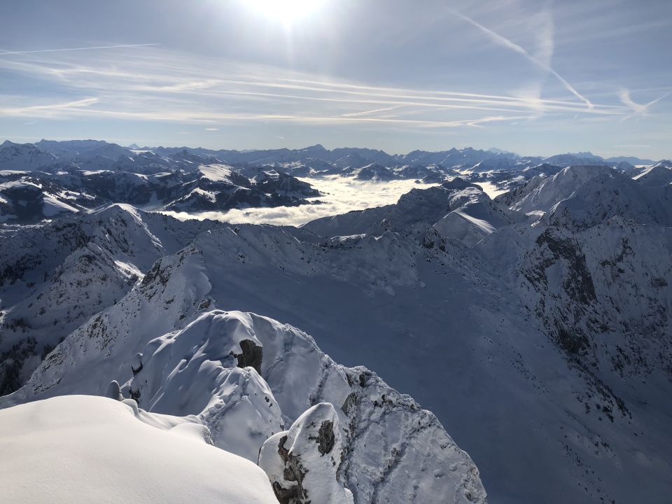 Ab Sangernboden über dem Nebel und Kaiserwetter. Ab Hengstkurve reicht der Schnee für den Aufstieg bis auf das Teersträsschen. Ab Schwendli 1500 ca. 15cm auf nicht solider Unterlage, aber rasch wird der Optimismus bestätigt und ab ca. 1650 ist's dann definitiv ein Traum: 20cm Pulver auf genügend Unterlage. Aufstieg bis Skidepot sehr passend. Ab Skidepot gute Spur für Fussaufstieg zum Gipfel.