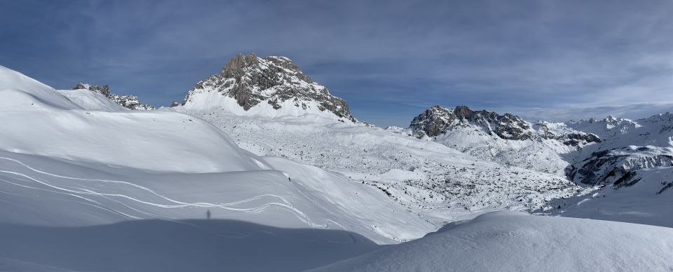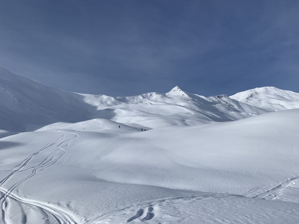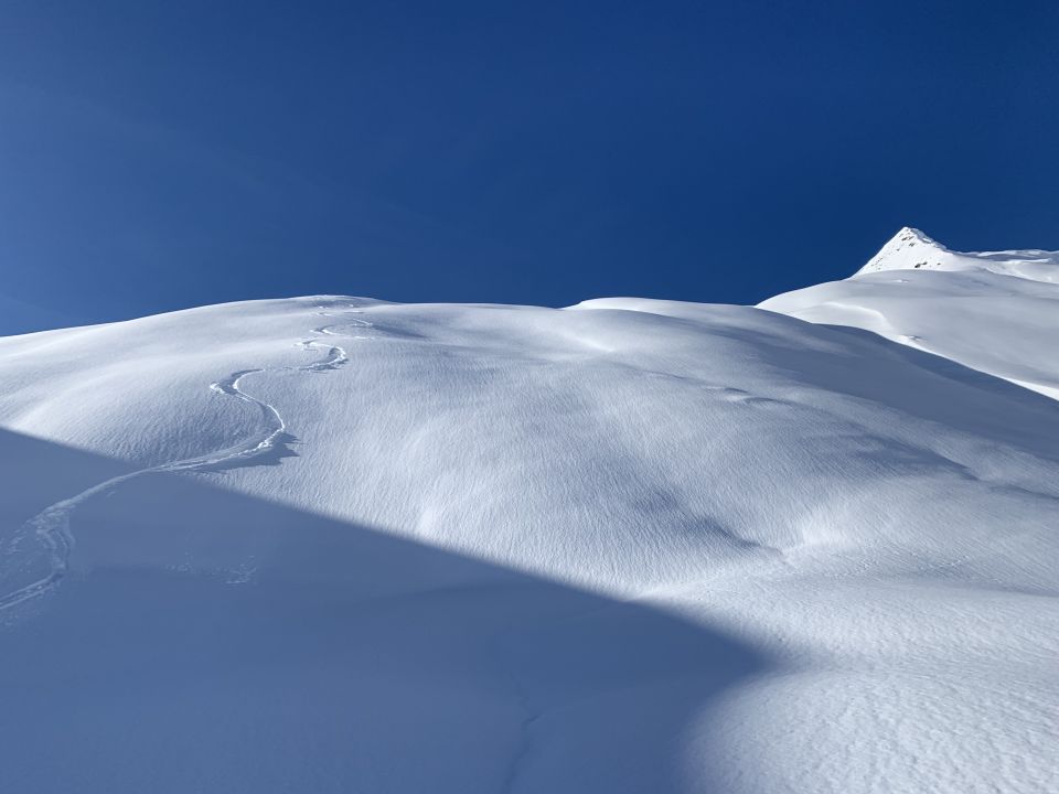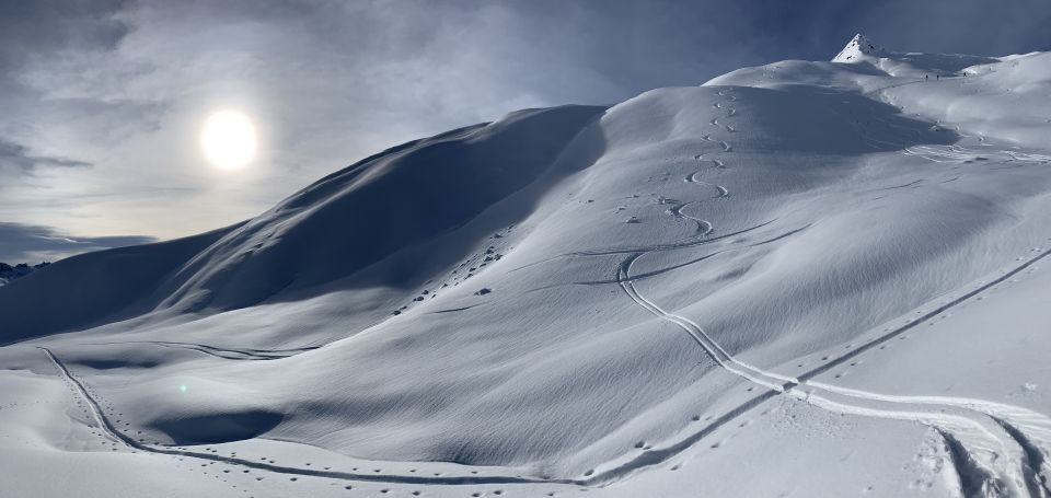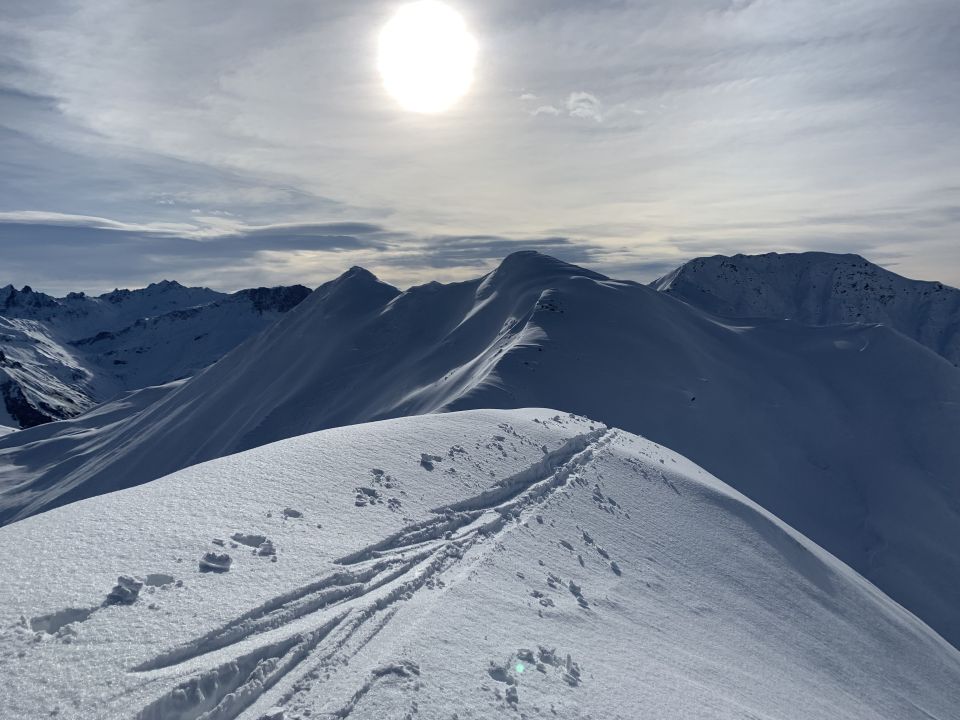 Das Smiley Gut gilt erst ab/über 2000 m ! Darunter viel zuwenig Schnee ! Strasse ab PP 1504 ca. 300 m Aper , danach stark vereist bis zum Abzweiger Undersäss . Strasse bis Alp Carschina mit dünner Altschnee Auflage die örtlich wegschmilzt , mit etwas Vorsicht aber fahrbar . Oben sind die alten Spuren mit 5-15 cm Pulver Nassschnee überdeckt/zugeweht , mit etwas Kraftaufwand schön zu fahren war.