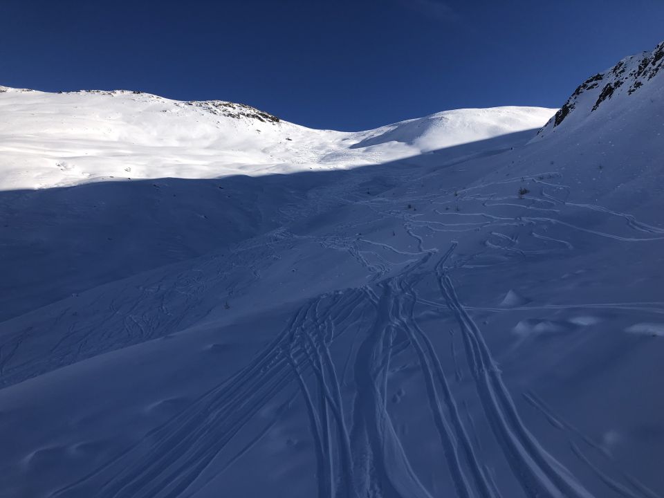 Traumwetter und Schnee in der unteren Hälfte kaum fahrbar. Dafür ostseitig des Gipfels in der Talrinne perfekt!