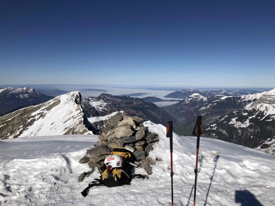 Milder Nachmittag, Schnee sonnseitig teils sulzig, Fruttseitig genug Schnee, Abfahrt zur Stöckalp unterhalb Unterboden zu wenig Schnee