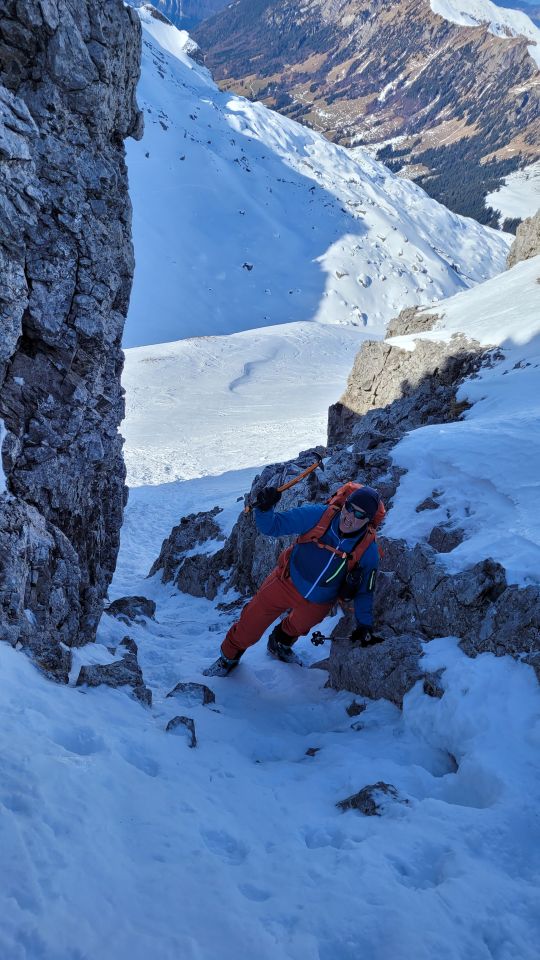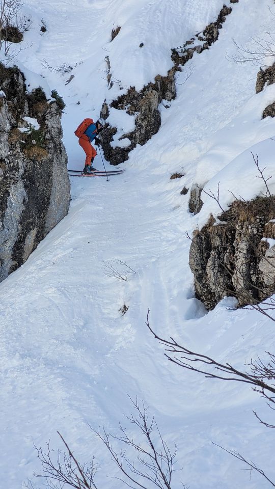 Abfahrt oben gut, Mitte ein paar Steinkontakte. Wir sind über Färlenzöpfli direkt nordwärts Schluchen runter, eng und steil aber gut und genug Schnee.