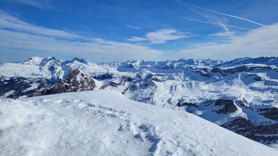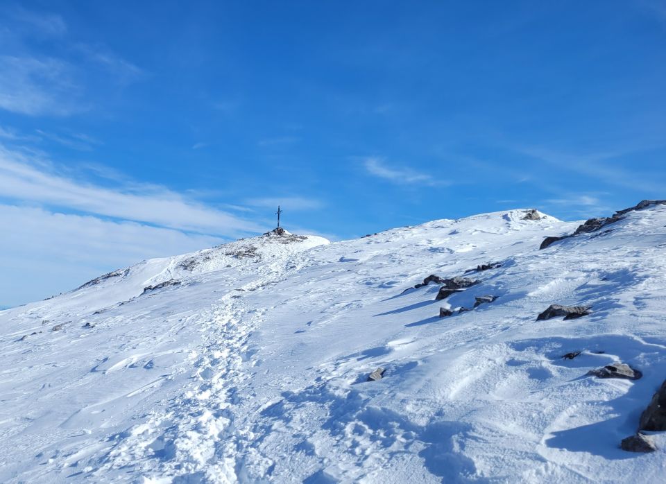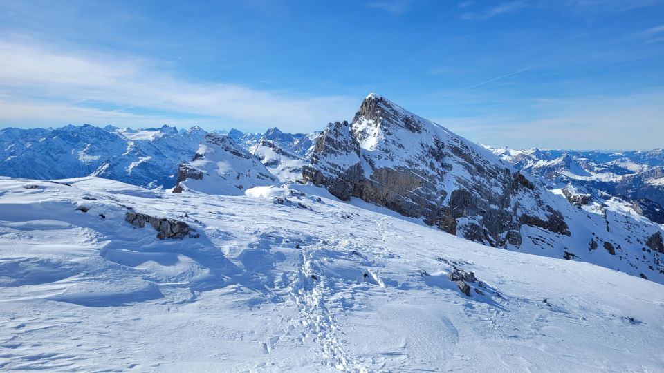 Ab Bergstation gut und genug Schnee bis zum Skidepot. Aufstieg in gutem Trittschnee auf den Gipfel. Momentan Steigeisen nicht zwingend, Pickel hilfreich.
