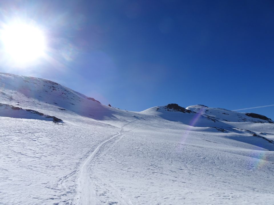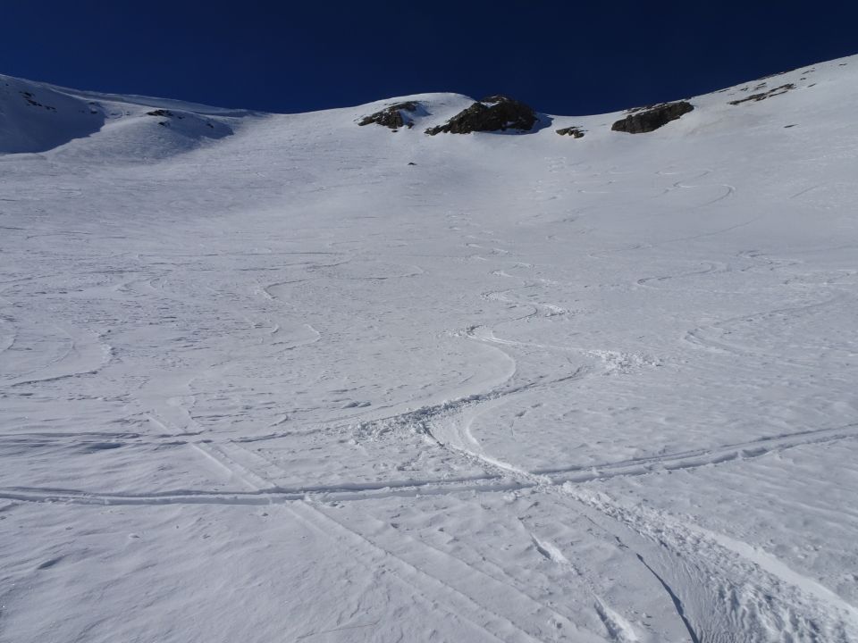 am Grat teilweise aper, erster Aufstieg zum Hundshorn sehr gute Spur in gutem Schnee, ca.50m zu Fuss wegen Gipfelwächte, Abfahrt ab Gipfel bis Rotstockhütte; erste Möglichkeit in den Osthang eingefahren Super Sulz, weiter unten dann tiefer Sumpf, Aufstieg zur Wasenegg; spärliche Schneeverhältnisse(trotzdem besser mit Ski), Abfahrt durchs Schilttal bis Skigebiet; schlechte Verhältnisse, alles vorhanden, ein paar Schwünge Pulver, Sulz, sehr tiefer Sulz, Bruchharsch...