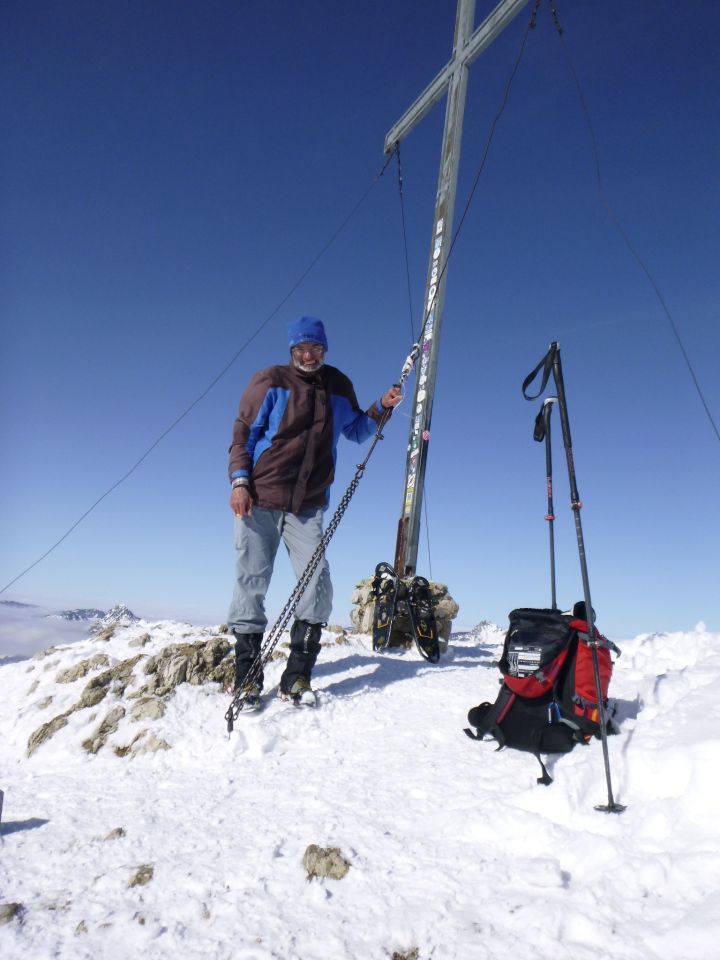 Tourenbeginn um 09:30 Uhr bei -5°C im sich hin und wieder auflösenden Hochnebel. 150 hm aufwärts war man kontinuierlich unter blauem Himmel. Am Gipfel blies immer noch etwas der kalte Nordost. Unten lagen ca. 25 cm Pulverschnee, auf den Nordseiten bis zu 30 cm von dem Neuschnee der letzten 3 Tage. Auf dem SW-Rücken erheblich weniger, da abgeblasen. Der Gipfel war gerade so mit Hartschnee bedeckt. Am Auto schon die SS angeschnallt. Besser geht’s gar nicht mehr. Die Natur-Skipiste ist nicht präpariert. Eine Scooterspur von gestern gab es über die Piste zur Krinnenalpe. Bis auf die Abkürzer folgte ich dieser bequem ohne einzusinken bis zur Alpe hinauf. Unbeschwerlicher geht’s kaum für SS-Läufer.