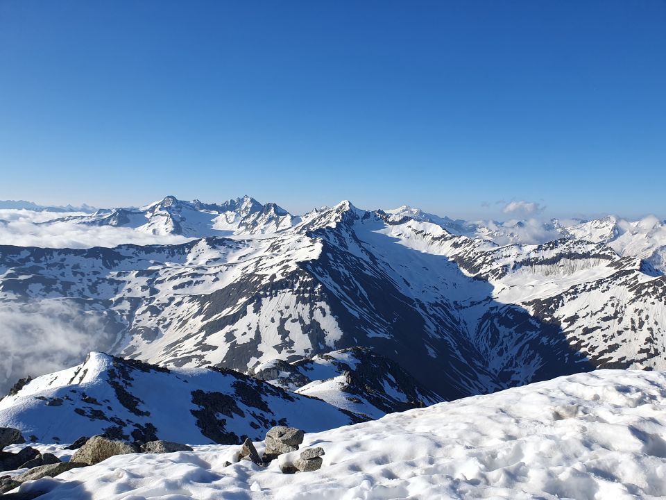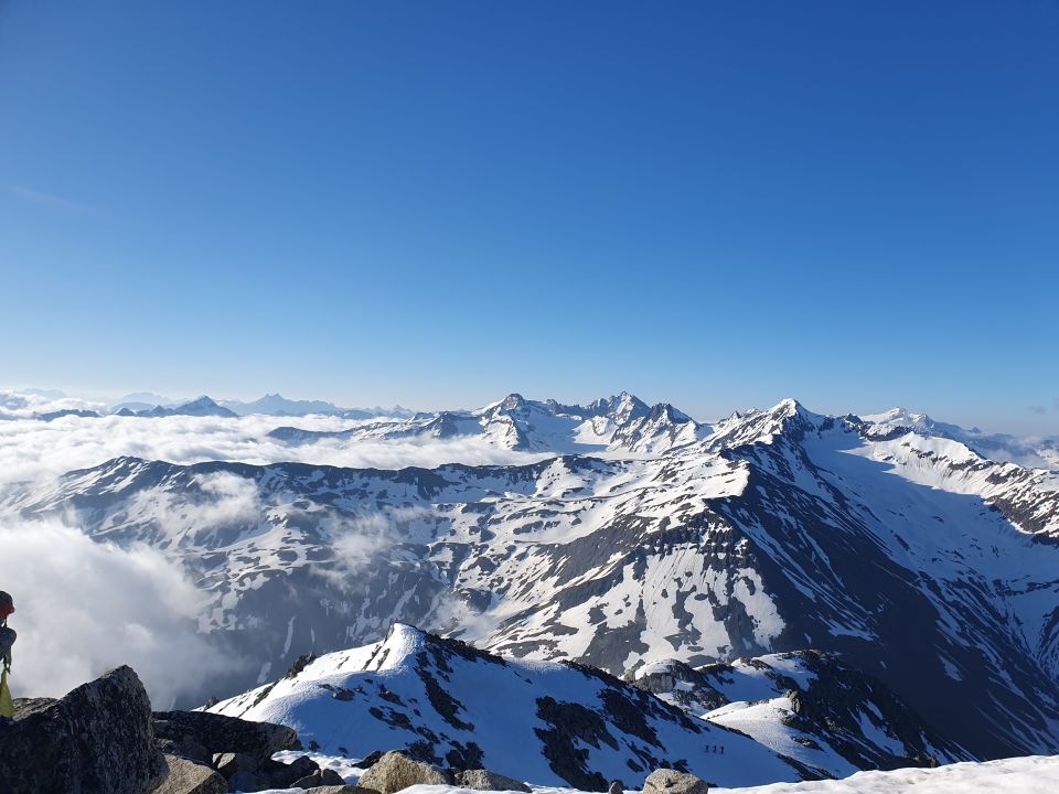 Ein früher Start lohnt. Da die Tour grösstenteils Sonnenbeschienen ist. Bei ca. Höhe 2800 Traverse ins Tal rechts notwendig, dann kommt schon der langezogene steilere Teil zum Gipfelgrat. Am Gipfelgrat links, Höhe 2900 bin ich nordseitig weiter aufgestiegen , mit Skis bis Skidepot. (Harscheisen hier hilfreich) Fussaufstieg Fels oder guter Trittschnee, keine Steigeisen notwendig. Abfahrt oben nordseitig noch hart, aber nur kurzes Stück Traverse, dann südseitig schöner Sulzschnee, im unteren Teil zunehmend Büsser Schnee aber gut drehbar, zunehmend weicher und schwerer. Heute um ca. 8.00 beim Gipfel abgefahren. Verhältnisse waren so gesehen Top.