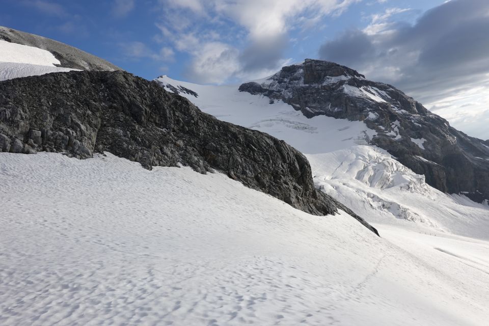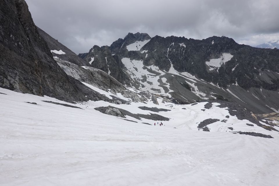 Noch einiges an Schnee, der ist aber gut zu gehen. Je höher man kommt, um so härter wird er. Steigeisen sind da hilfreich. Ketten fast frei, der Ausstieg ist etwas unangenehm . Gletscher aktuell perfekte Bedingungen, Spalten gut zu.