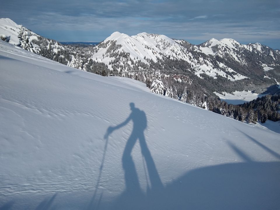 Vom Heidenkopf zur Oberen Siplingeralpe Hangneigung gerade ausreichend um den Pulver zu genießen