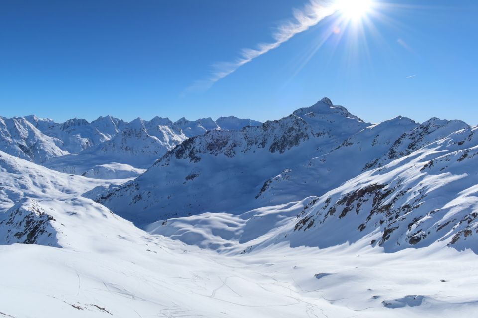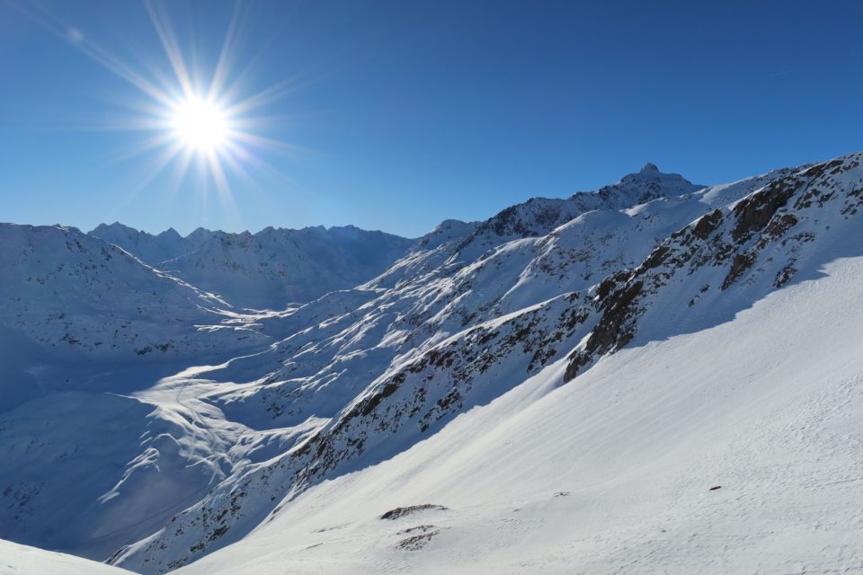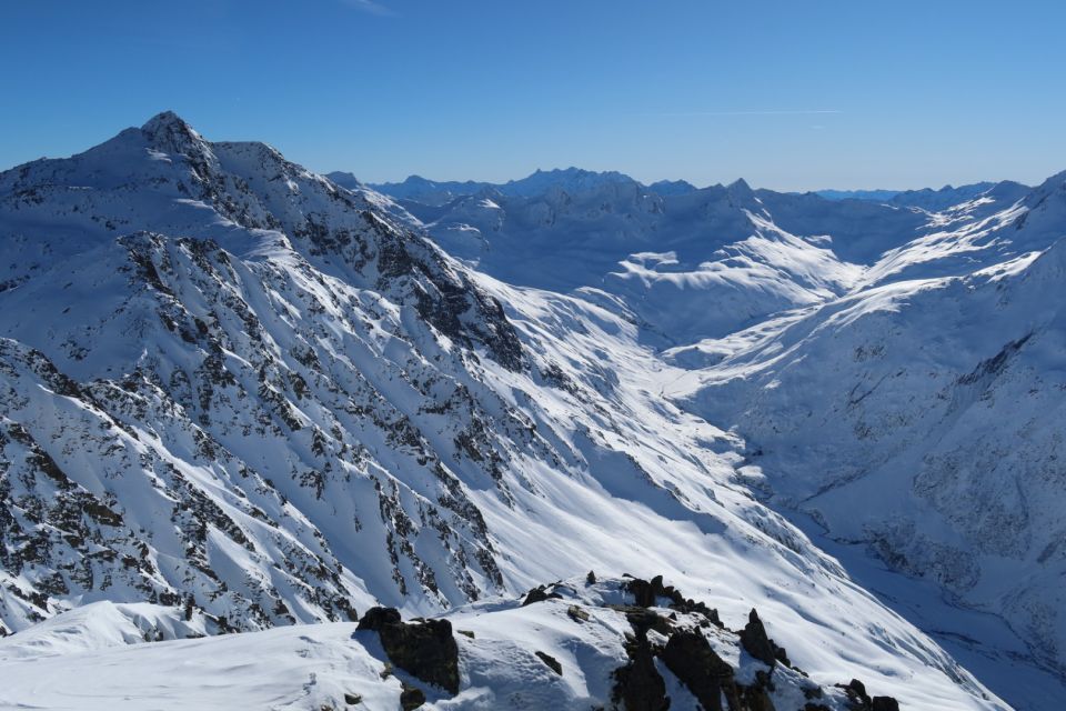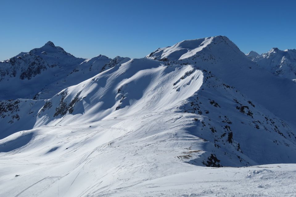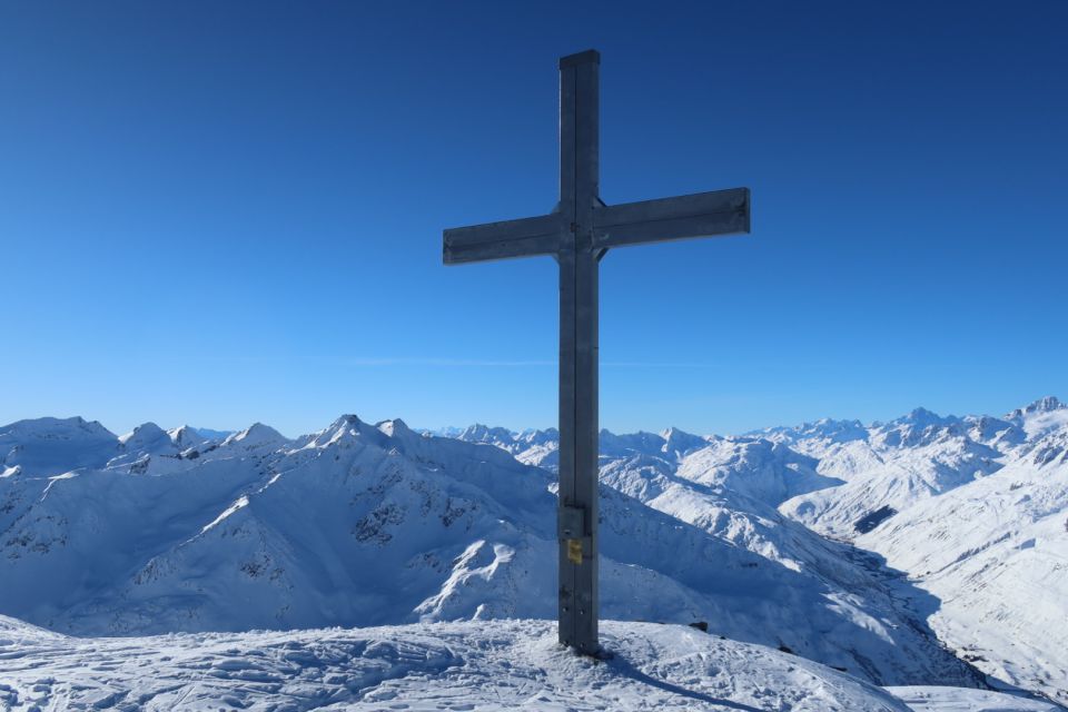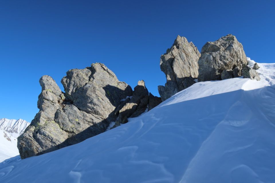 Aufstieg zum Pazolastock im unteren Bereich auf etwas rutschiger Spur, unter anderem wegen vorangegangenem Windeinfluss. Es ging gut ohne Harscheisen, war aber auch nicht super angenehm. Der Übergang zur Südseite war an einer Stelle etwas trickreich wegen Fischmäulern, die sich fast durch den ganzen Hang ziehen. Dank guter Spur und gerade noch genug Schnee an der entscheidenden Stelle ging es ohne die Ski abzunehmen. Weiter ging es angenehm zum Gipfel hoch. Ganz oben gab es viel Hartschnee.