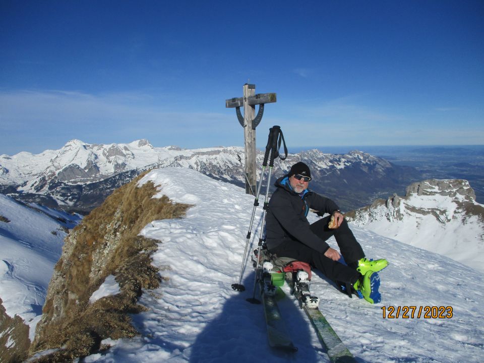 Mein Tourenpartner Valdi auf Skiern war auch ganz zufrieden, war aber ob seiner Harscheisen im Aufstieg ganz froh. Tricky mit Skiern vor allem der teils ausgeaperte und recht vereiste Hang vom Isisizer Grat abwärts in Richtung Rosswis.