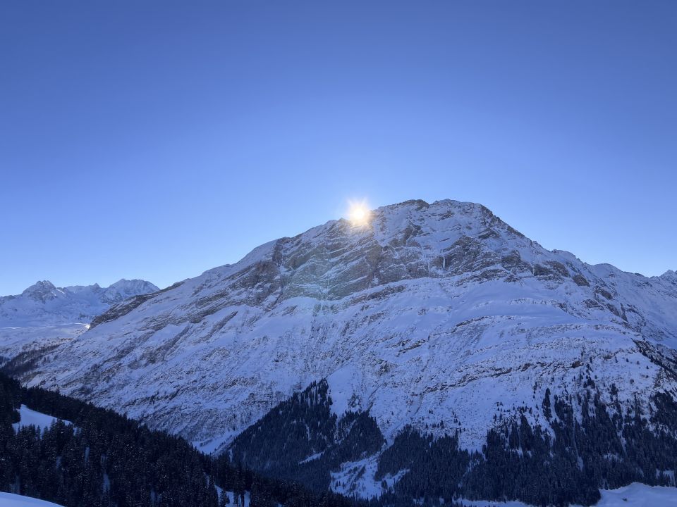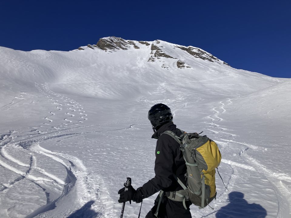 Auf der Aufstiegsroute am Rücken tlw. bretthart, in der Abfahrt durch die Mulden dann unverhofft bester Pulver. Weiter unten dann sehr schön in leicht aufgesulztem Schnee nach Nufenen zurück.
