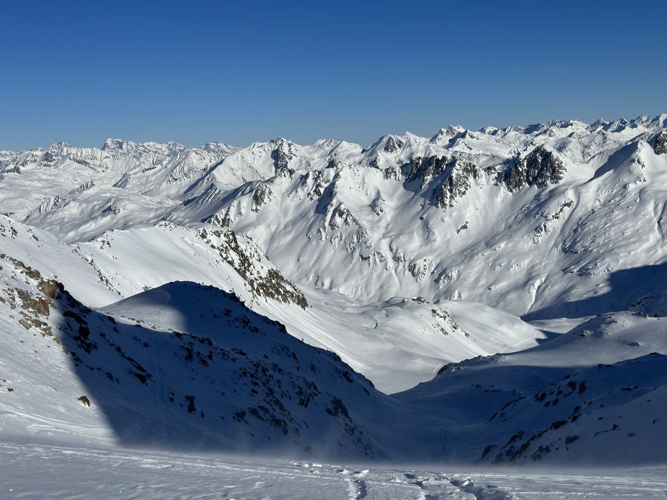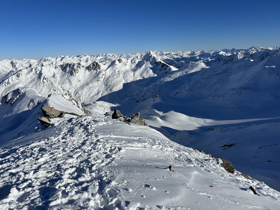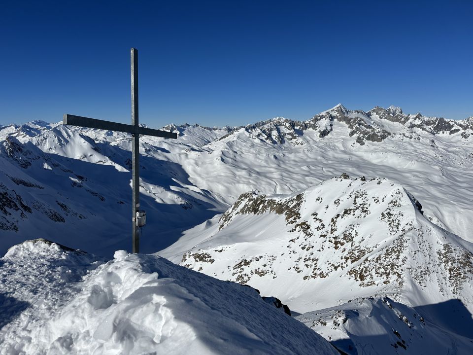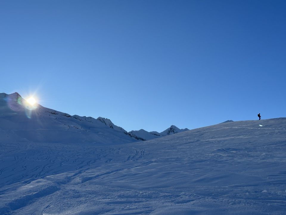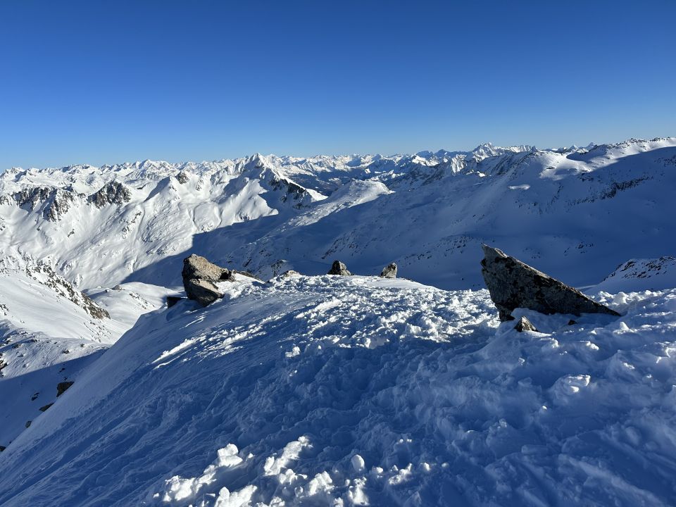 Beste Verhältnisse, Pulver von oben bis unten, wolkenloser Himmel, Granaten Sicht, nur der Wind am Gipfel ein bisschen lästig. Wenig los am Gipfel, Rotälli war dagegen gut besucht.
