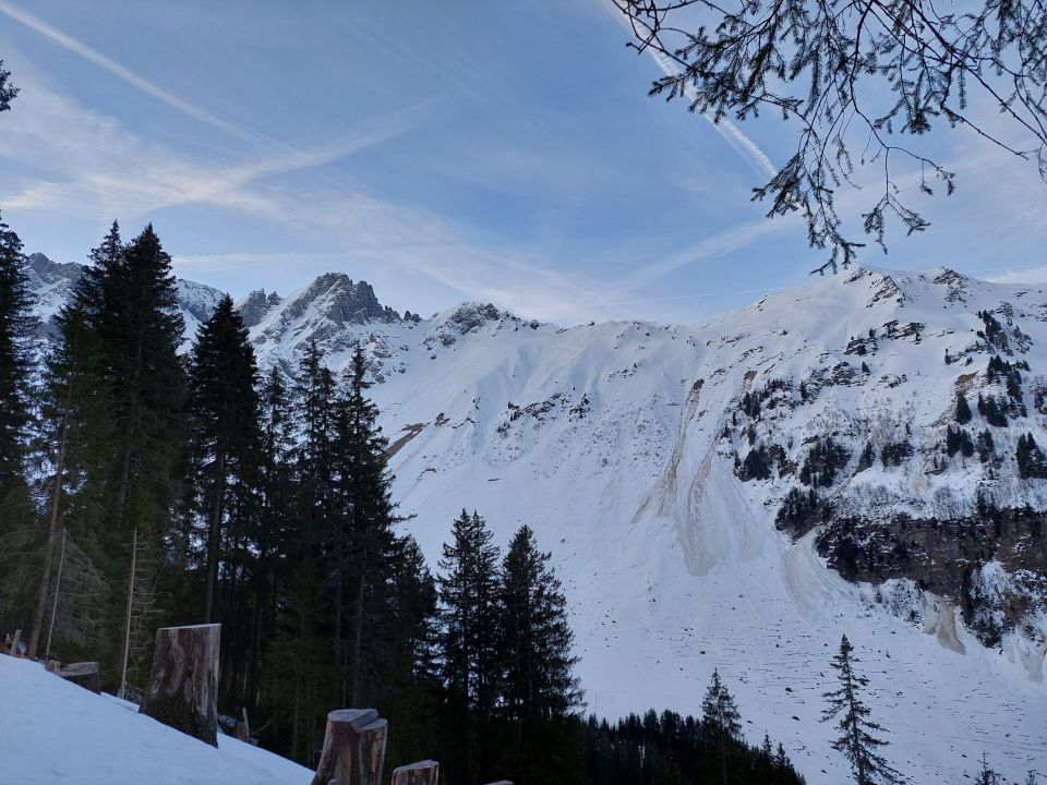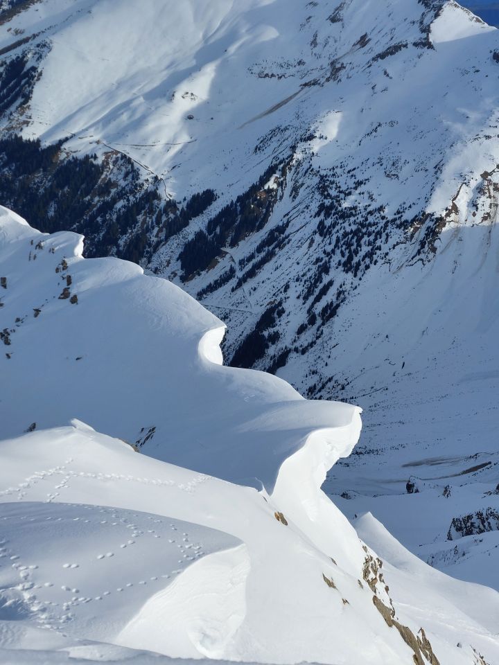 Abfahrt: Der Gipfelhang ist ruppig und sehr hart. Unterhalb querte ich zum Pt. 2416 und fuhr den schattigen Hang, der noch Pulver hatte, hinunter. Von da an bis Mittelberg und Steibode hat es Hartschnee. Man kann noch bis zum Parkplatz fahren.