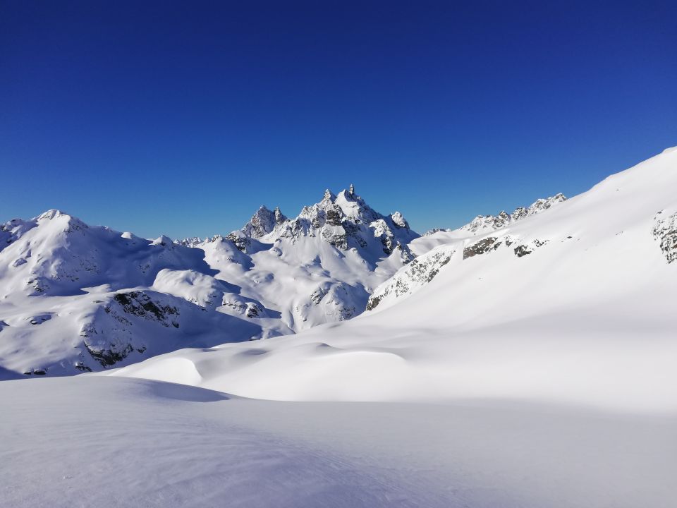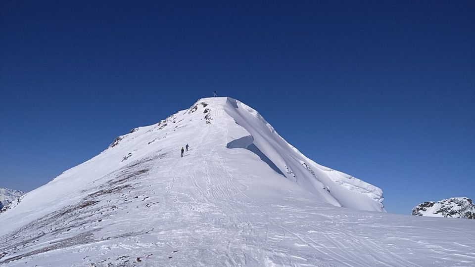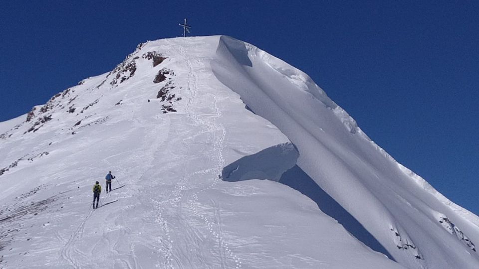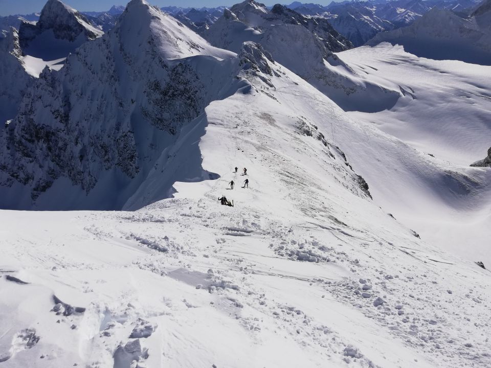 Leider haben wir miterleben müssen wie ein Tourengeher zu weit Richtung rechts ging (Sichtrichtung Gipfelkreuz) und die Wächte ausgebrochen ist und er somit 400-500 Meter abgestürzt ist und leider nur noch tot geborgen werden konnte.