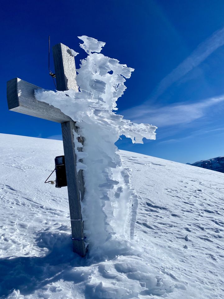 Im Euloch hatten wir zum ersten Mal Blick auf die imposanten Wechten unterhalb Punkt 2395 (Furggele). Beim kleinen Felsen beim Wegweiser hatte es einen Durchgang. Der für uns einzig gangbare Weg schien rechts des Sommerweges, denn ca. 10 - 15 Höhenmeter unterhalb der Wechten hat es eindrückliche Gleitschneerisse, die einige Meter tief sind und teilweise mit Schnee bedeckt sind. Man wähnte sich in einer Gletscherlandschaft im Hochgebirge. Auch hier haben wir entschieden, die letzten Meter zu Fuss zu überwinden, weil der Verlauf der Risse von unten nur schwer einzuschätzen war. Aufstieg erwies sich allerdings als problemlos, weil wir guten Trittschnee vorfanden. Von da ging es mit Steigeisen und Pickel zum Gipfel. Schnee unterhalb des Gipfels ist entweder hart oder verblasen aber ohne grosse Schwierigkeiten machbar. Man kann auch mit den Skis bis zum Skidepot, was den Abstieg etwas verkürzt.
