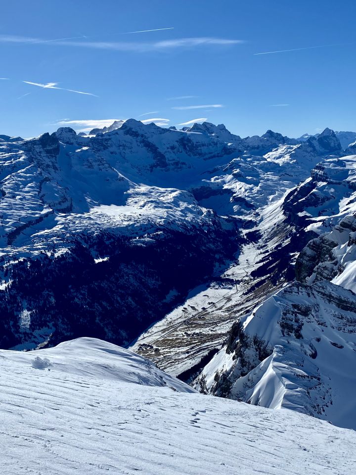 Abfahrt im harten, windbearbeiteten Schnee war nichts Besonderes. Wir wollten das Fanen-Couli runter, allerdings sind wir aufgrund meines grandiosen Fehlers im Kartenlesen nördlich davon im Ost-Couli gelandet, da wo auch der Sommerweg durchgeht. Habe mich vom Wegweiser irritieren lassen. Also nächstes Mal besser noch einmal einen Blick auf die Karte werfen, bevor es losgeht! Dieser Weg schien uns kaum fahrbar (bitte nicht den Spuren folgen!), weshalb wir uns auch hier entschieden, zu Fuss hoch zum Wegweiser und der Aufstiegspur zurück nach Bützi, Ortstockhaus und Braunwald.