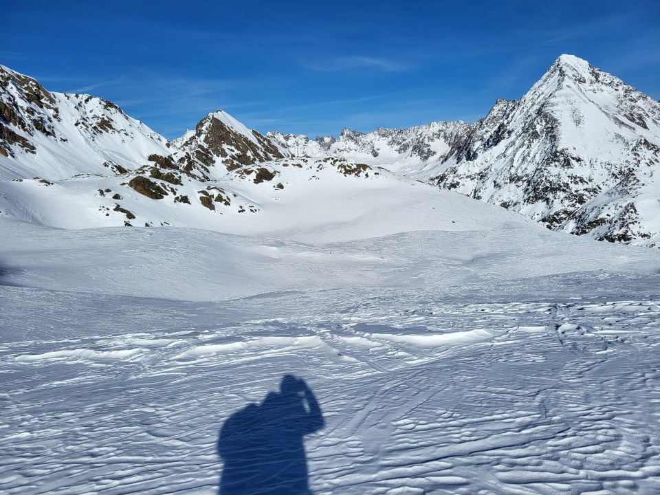 Der Wind der letzten Tage war abgeflaut. Abfahrt teilweise noch Pulver, sonst Windgangeln, Bruchharsch uns kurze tragende Stellen.