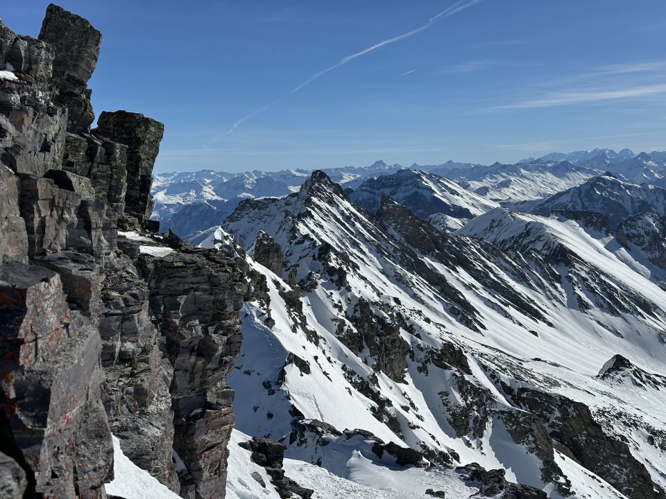 Gut, wenn man es hart mag, gerne auch ausgezeichnet - es hat, wenngleich der Wind viel mitgenommen hat, ausreichend Schnee und die Hänge an der Wildseelugge und am Pizoljoch sind zwar hart, aber nicht eisig, fast noch ein wenig pulvrig, sodass die Abfahrt durchaus Freude macht. Alles andere war ohnehin perfekt heute, der unterwegs frische Wind am Gipfel nurmehr schwach; der Aufstieg zum Gipfelkreuz breit ausgetreten, Seile frei. Tolle Sicht, wolkenloser Himmel, warme Sonne, eher März mäßig …