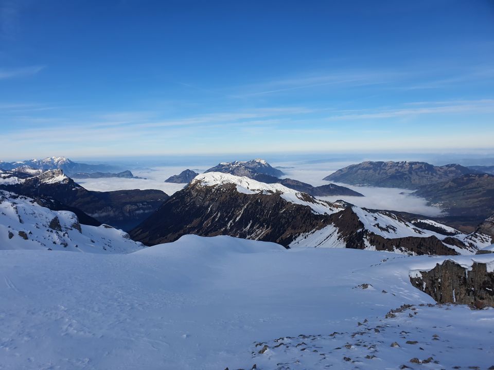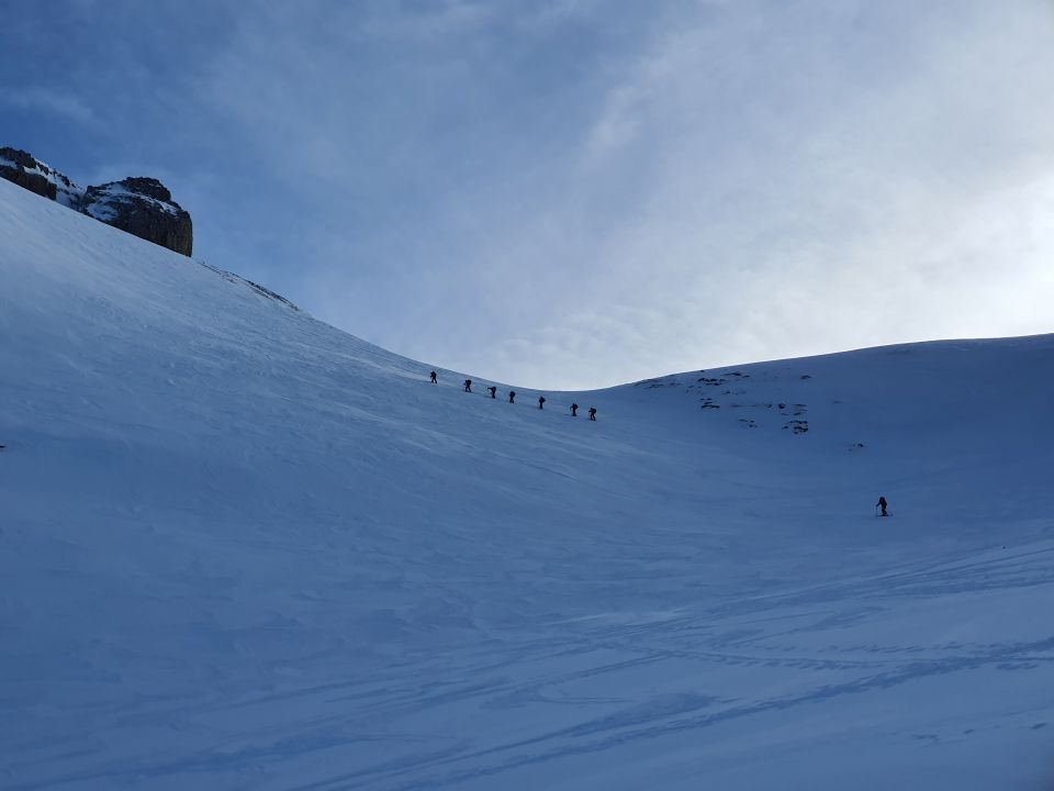 Aufstieg mit Harscheisen. Ab Skidepot mit Steigeisen und Pickel von Vorteil, mit dieser Ausrüstung problemloser Gipfelanstieg. Abfahrt unterhalb dem Skidepot eisige Stellen, besser etwas östlicher abfahren. Mittelteil sehr schöner Pulverschnee auf fester Unterlage. Unterhalb der Alp Alt Stafel im steilen Hang ganzer Hang pickelhart, schwierige Abfahrt, abrutschen, ausrutschen verboten. Auf der andern Talseite bereits apere Stellen, an zwei Orten Ski tragen bei dreckigem Weg. Dann wieder guter Hartschnee.
