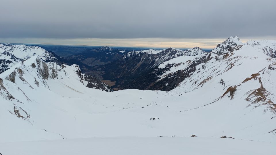 Solide Schneedecke in den frühen Morgenstunden. Grat ziemlich freigeblasen und mit etwas Kraxelei begehbar.